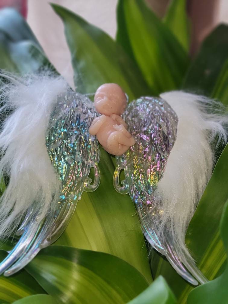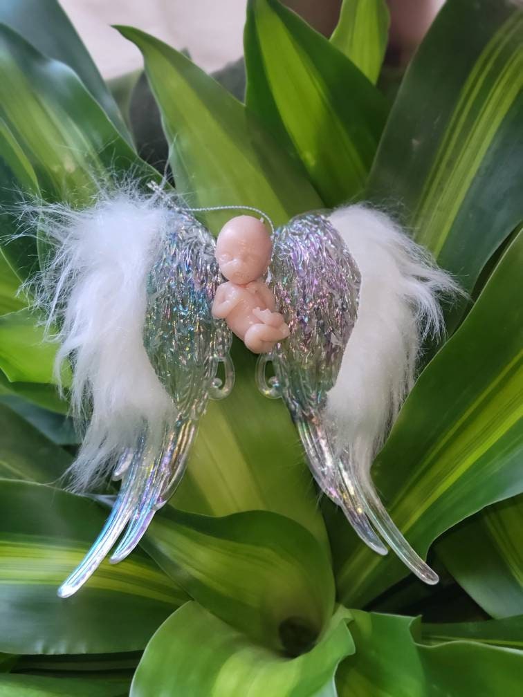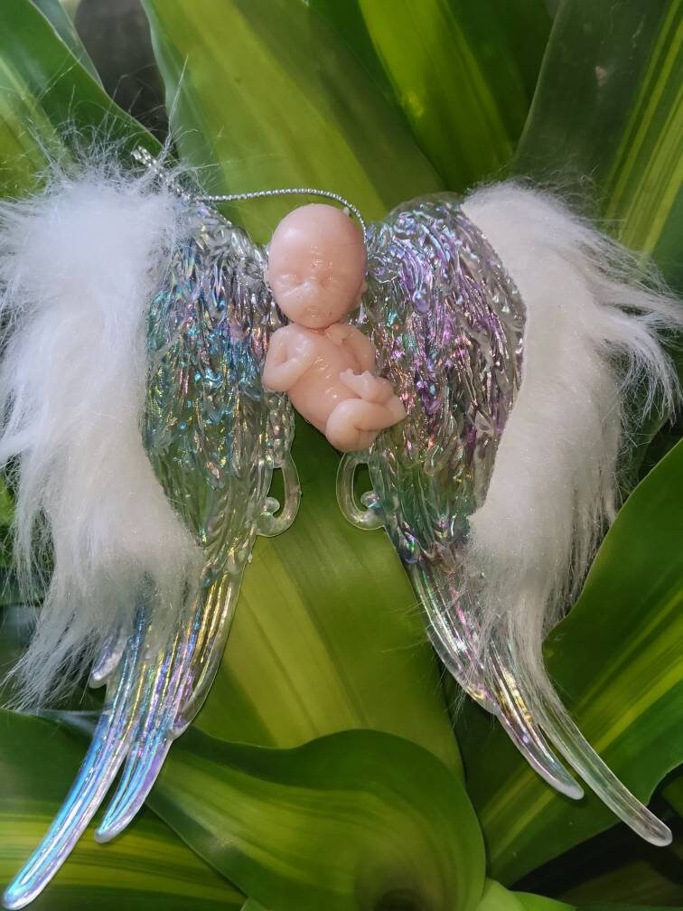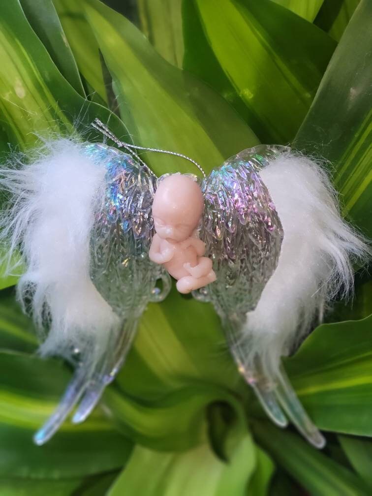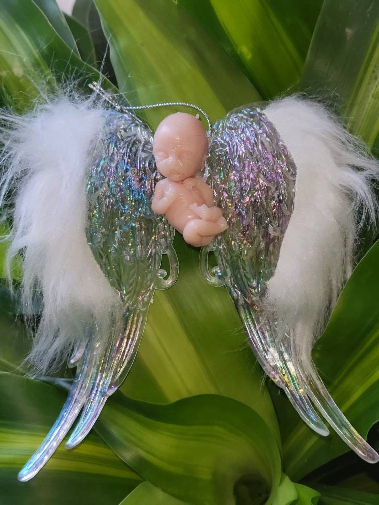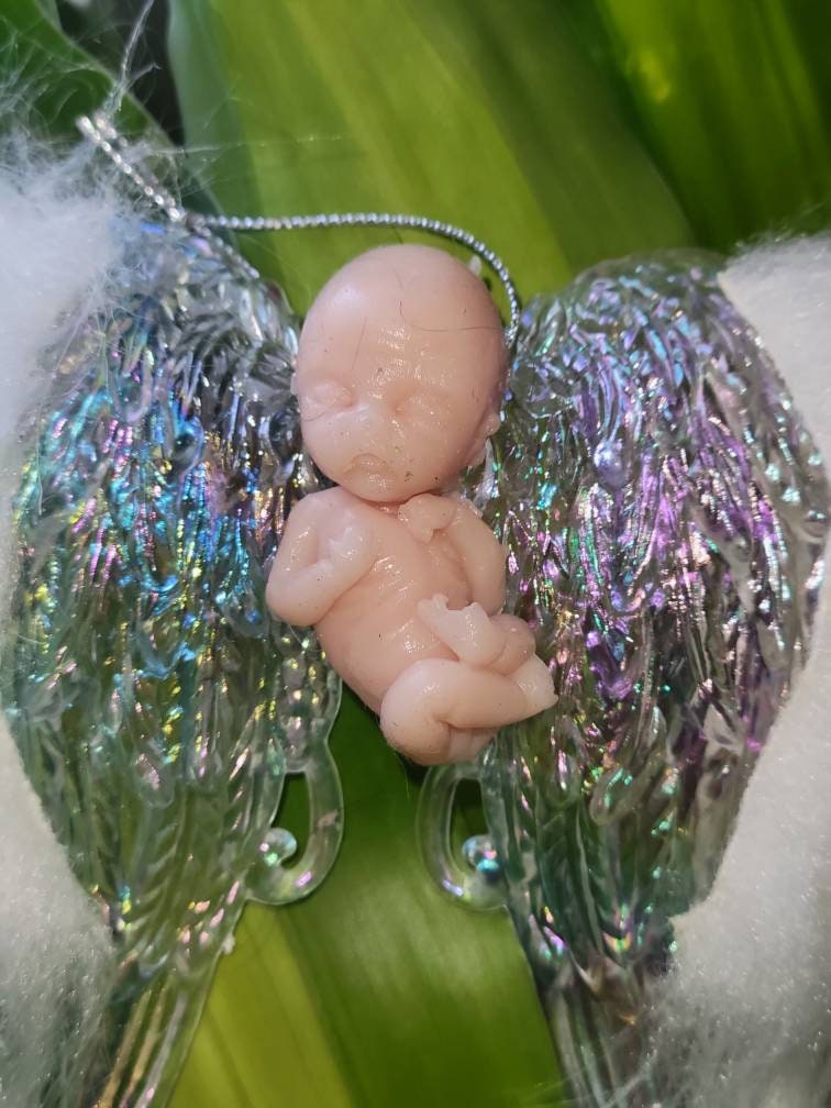 Silicone baby on angel wings ordement that can be hung up. Real sizing gestational sizing comes with card great for gifts for those who have lossed a baby . The baby in photo is missing a toe, yours will not