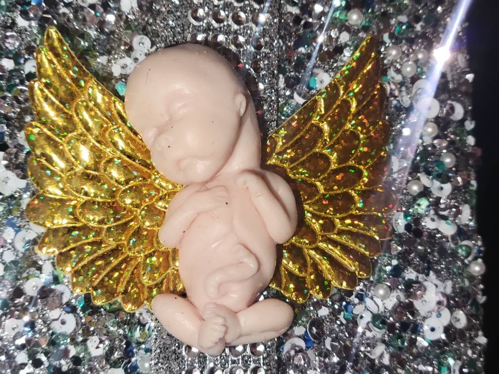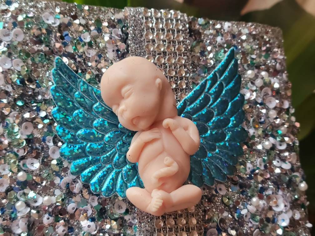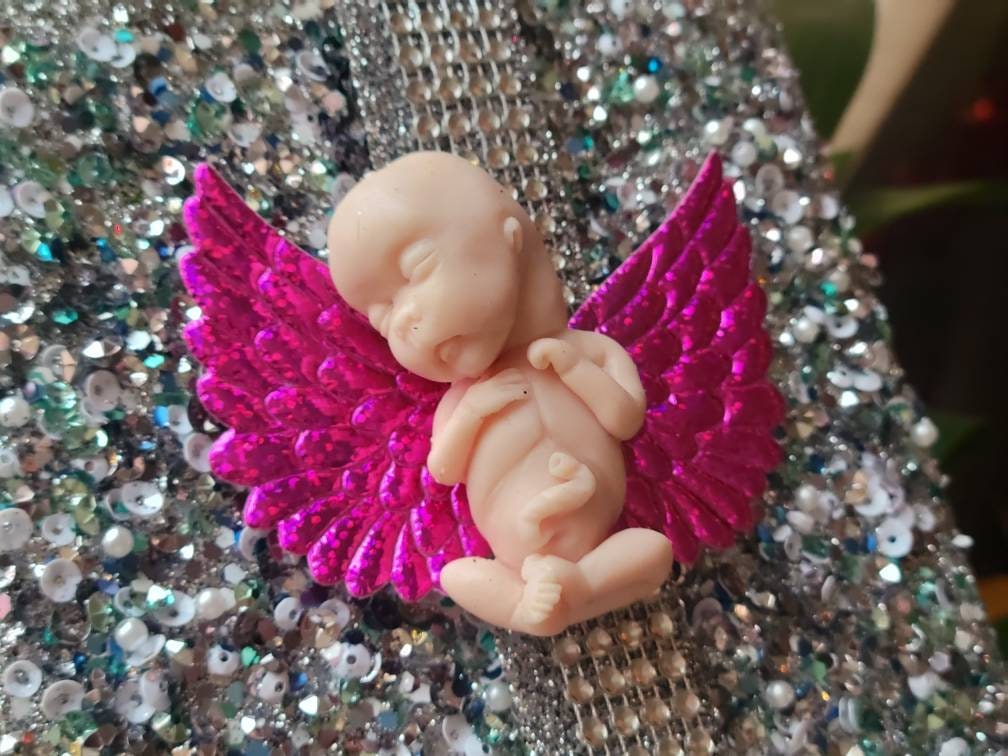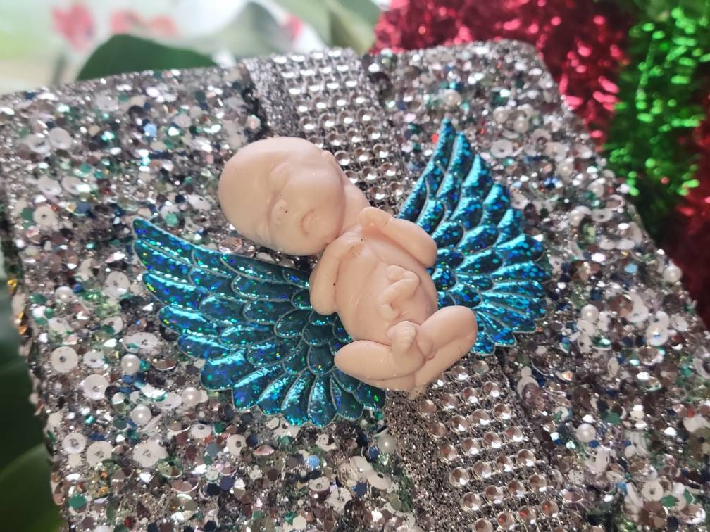 Real sizing gestational fetus 14 weeks , in soft blend silicone eco flex 10. You choose color of fetus, and color of wings. Back of fetus is flat back. Each baby is custom specially and comes with beautiful memorial card.