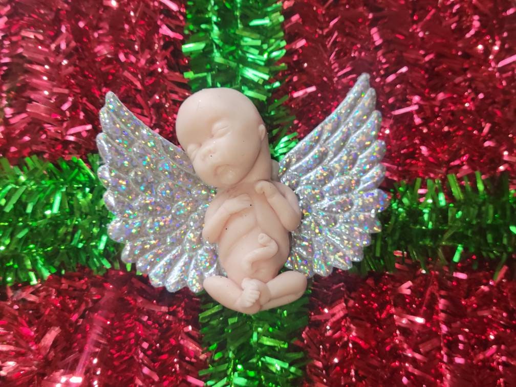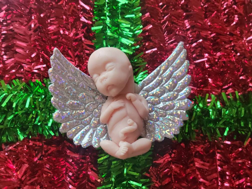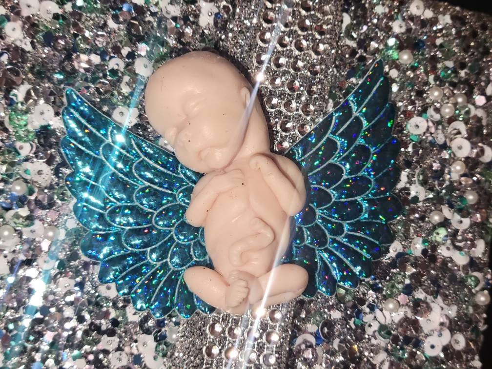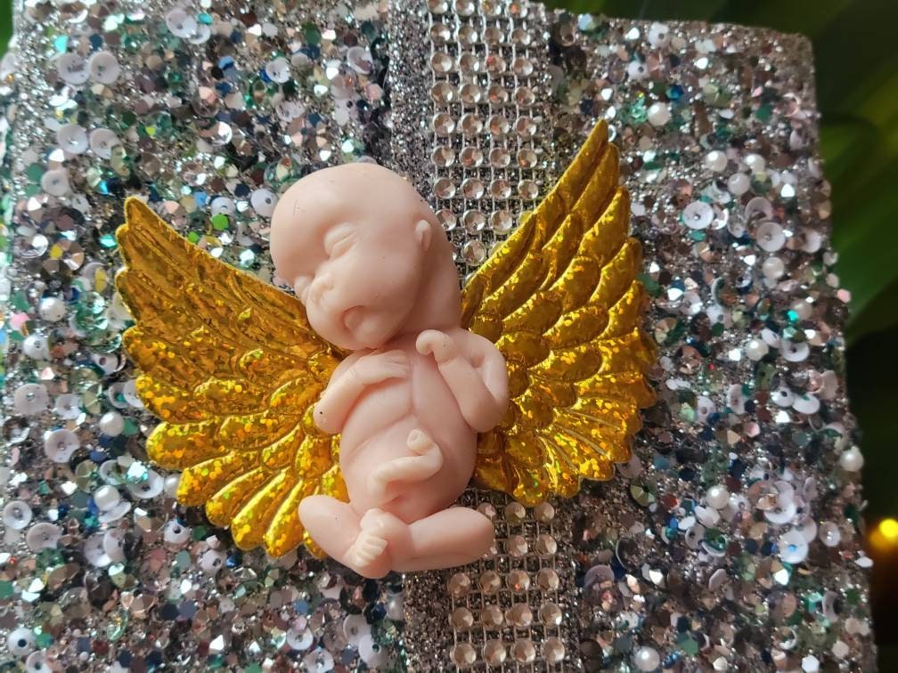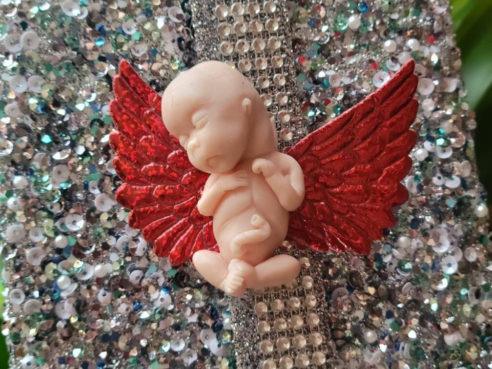Real sizing gestational fetus 14 weeks , in soft blend silicone eco flex 10. You choose color of fetus, and color of wings. Back of fetus is flat back. Each baby is custom specially and comes with beautiful memorial card.