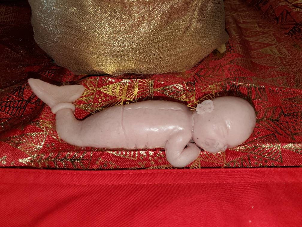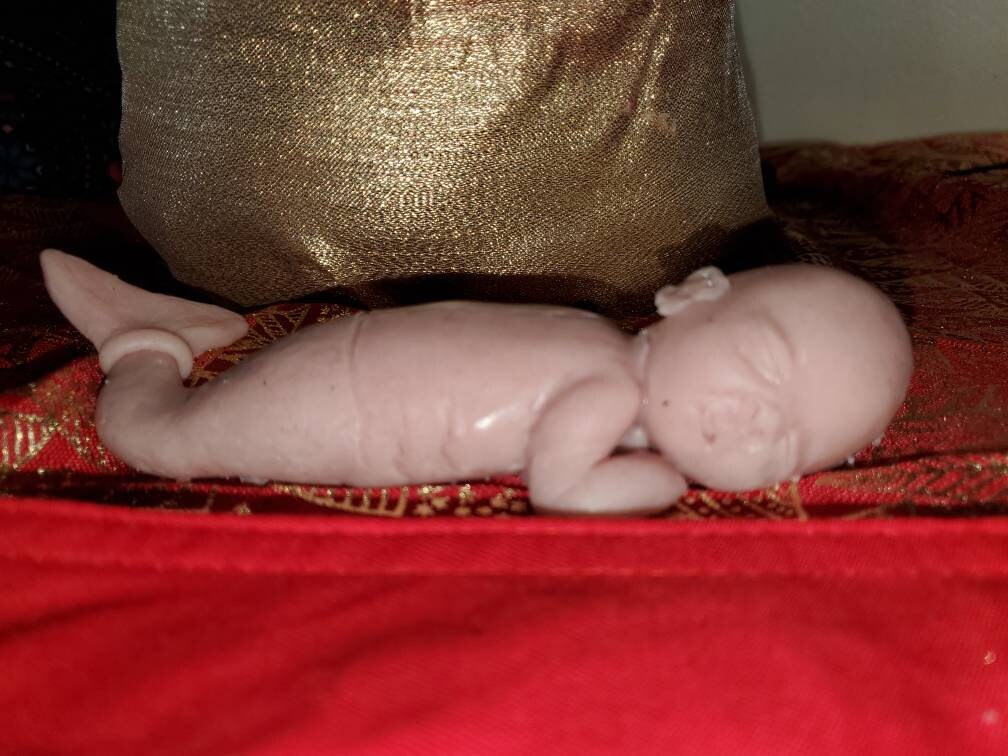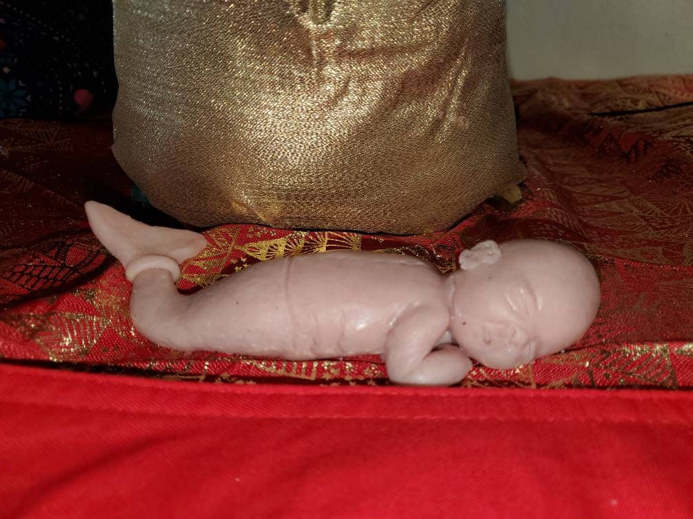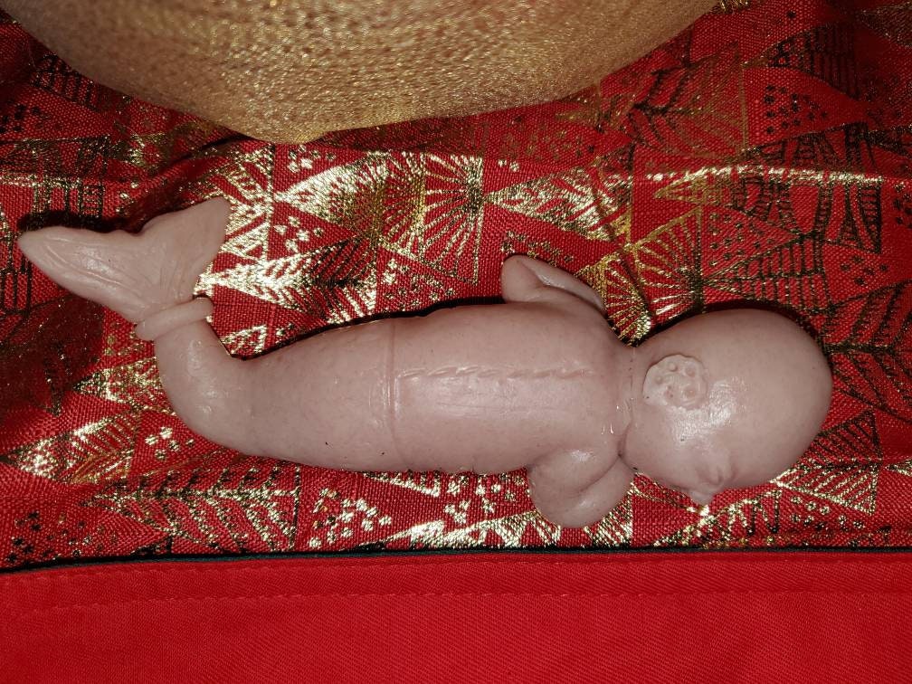 Baby has flat bottom side, but fully details front side. Poured in soft blend silicone. Sculpted by Michelle Brier mandly. Poured by myself.