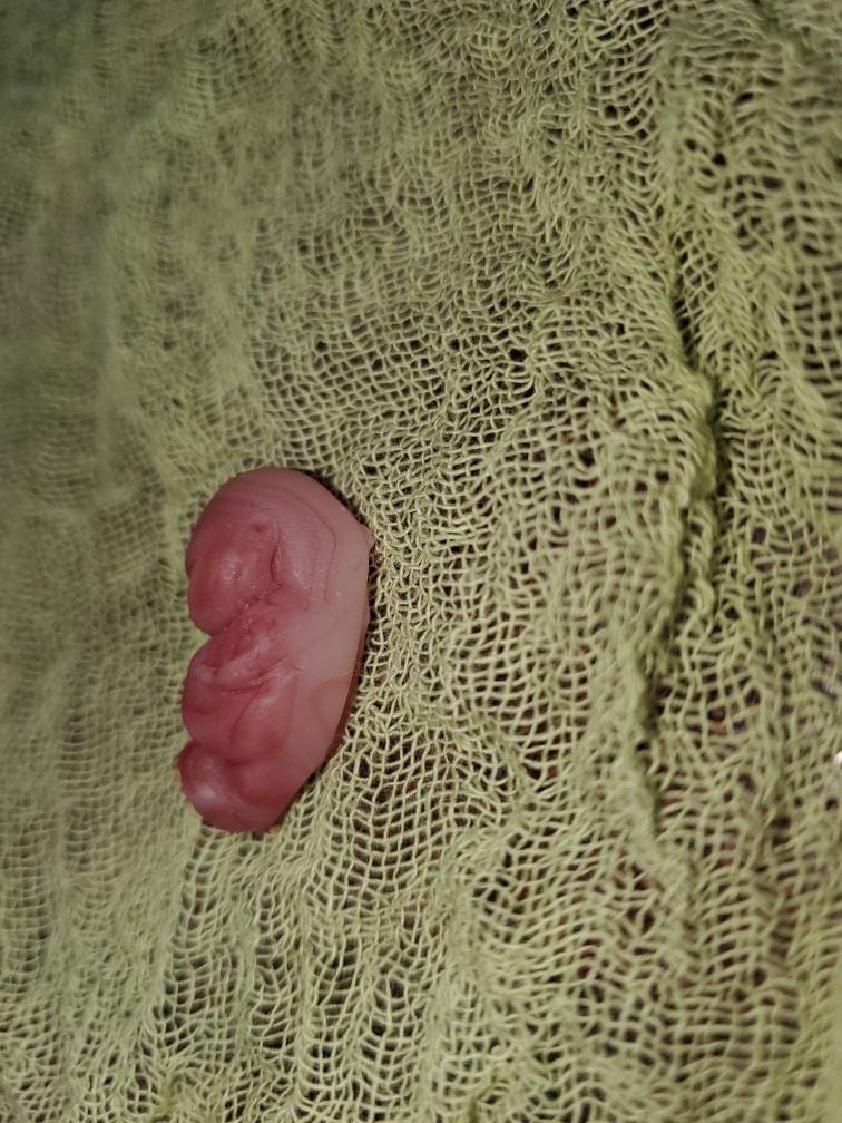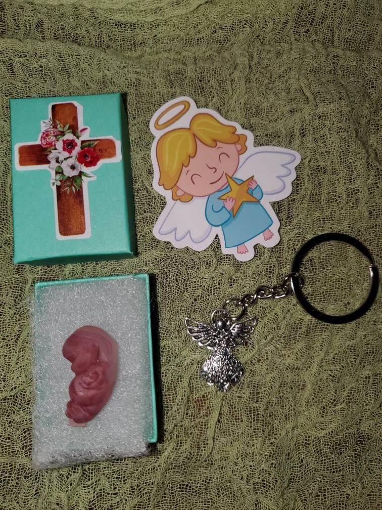 Real size gestation.  Great memorial gifts I can ship within the next day or two. Very soft silicone , squishy and bendable. No fetus ever comes out exactly the same, they are all special in their own way. Comes with what's shown in photo has flat side