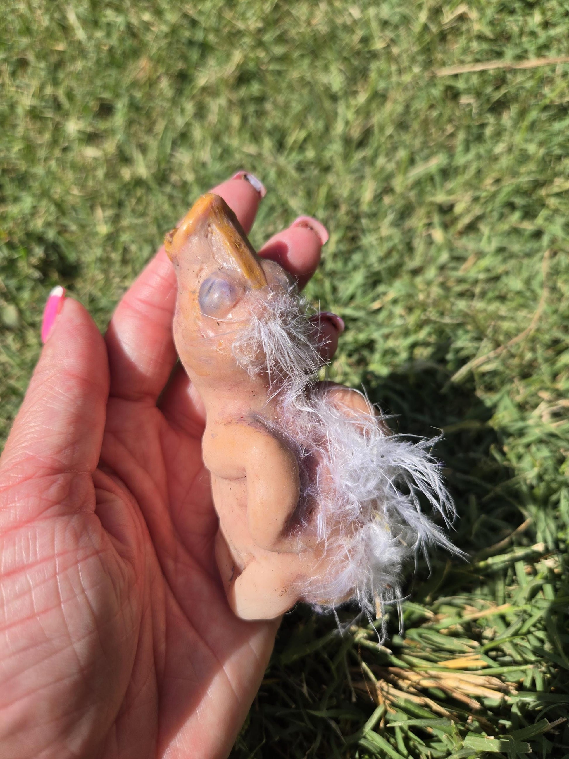This tiny 4-inch silicone baby bird is full of personality and charm! Hand-poured in soft, flexible silicone and lightly detailed with fluffy "feathers," this little oddball is perfect for fantasy collectors, art doll enthusiasts, or anyone who loves strange and unusual creatures.