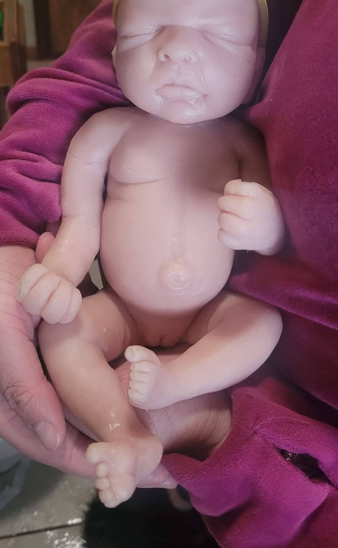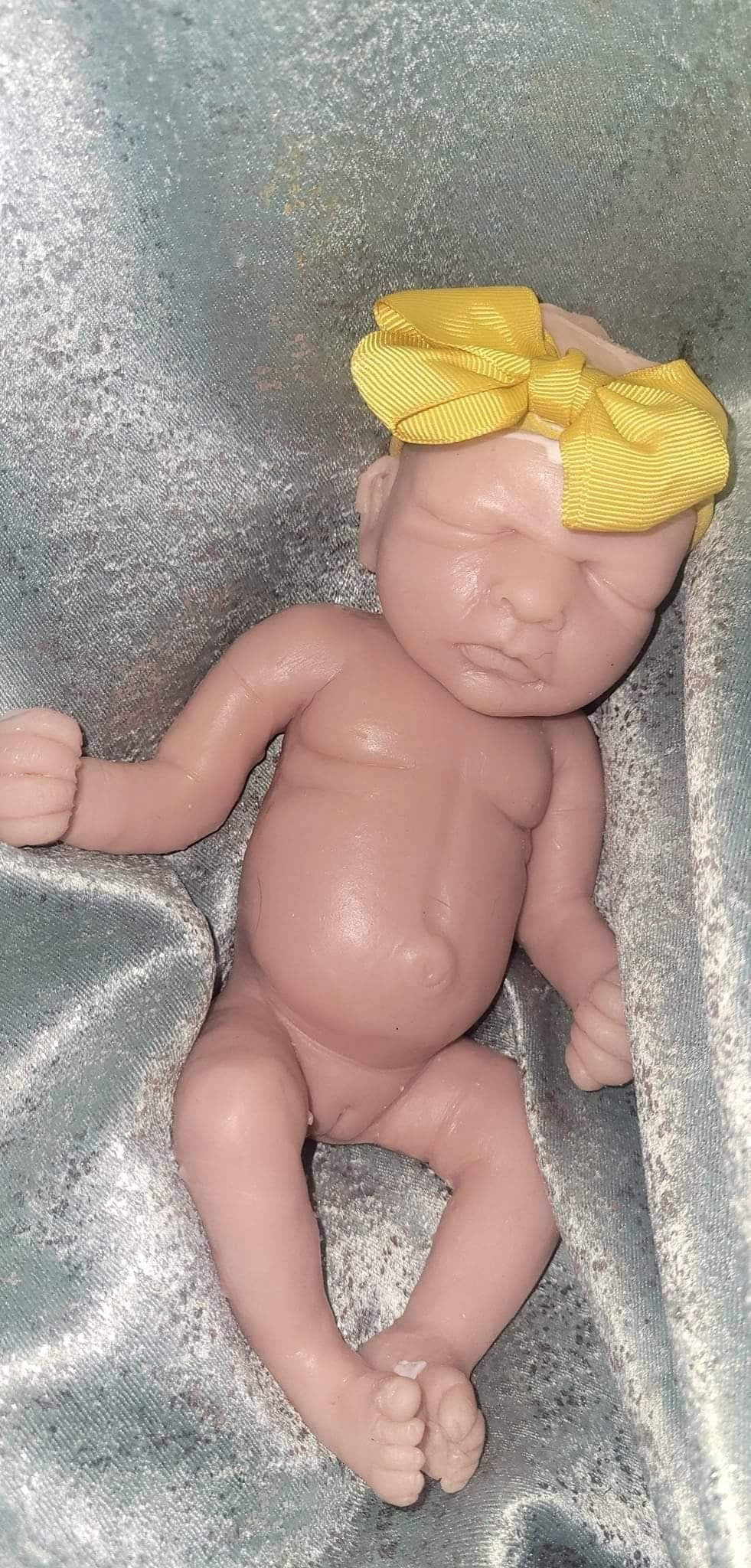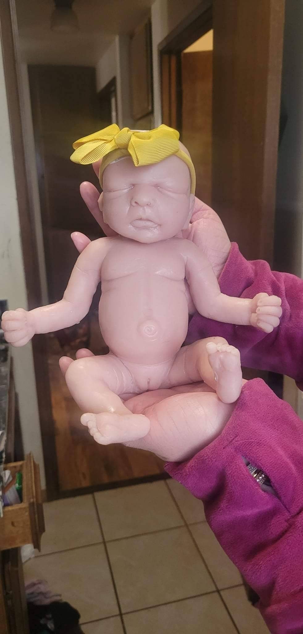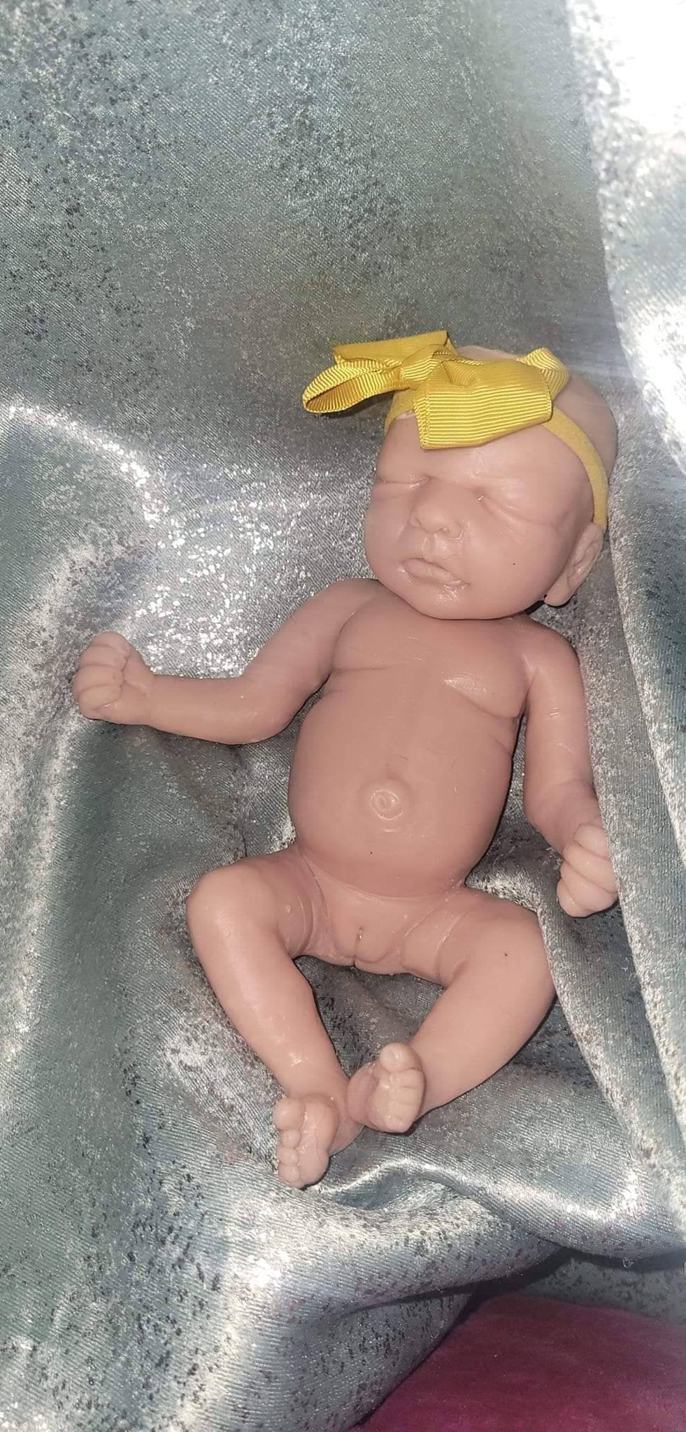 Or bottle. She is very detailed. Arns to the side. She is aprx 11" preemie. Each baby is poured custom to order selling as boo boo babies since they do have some imperfections random lumpy spots upon body nothing severe. No returns. She is not perfect and has some flaws.
