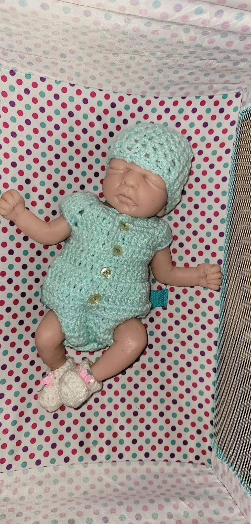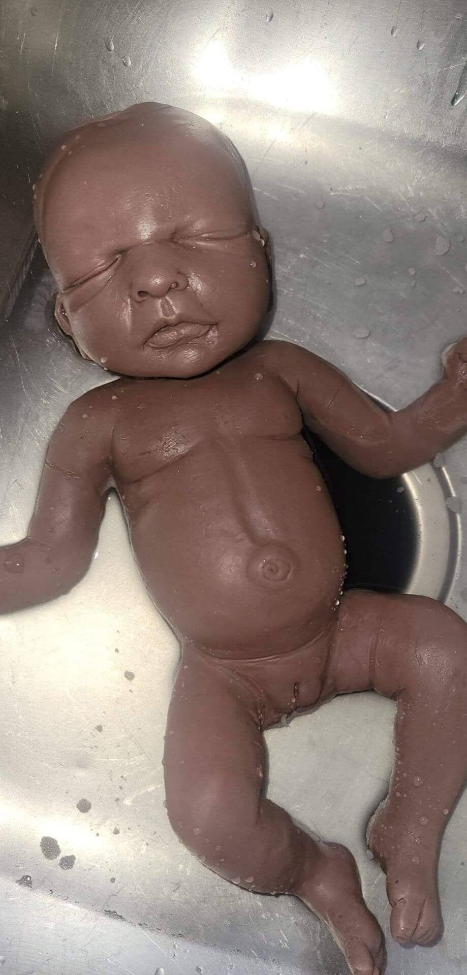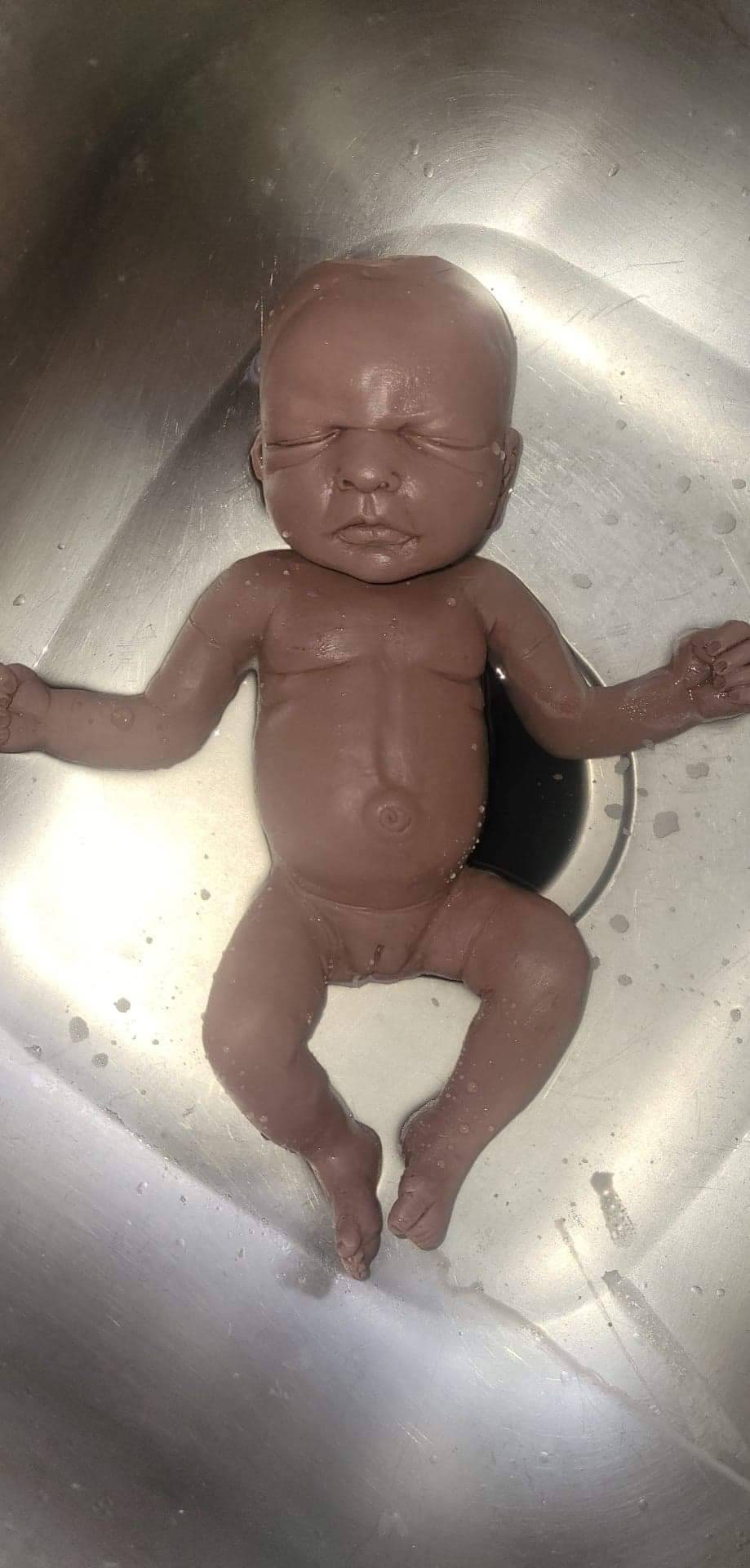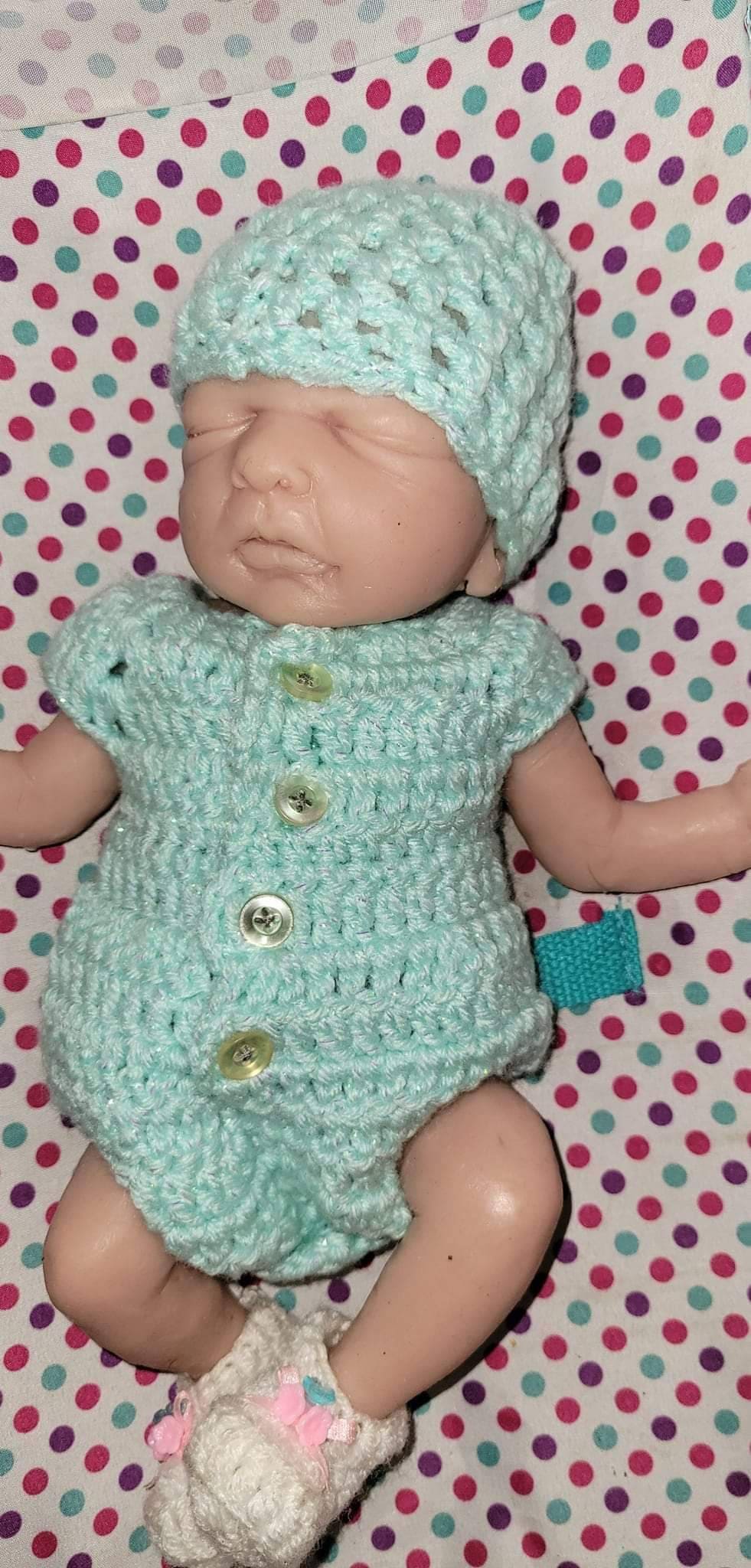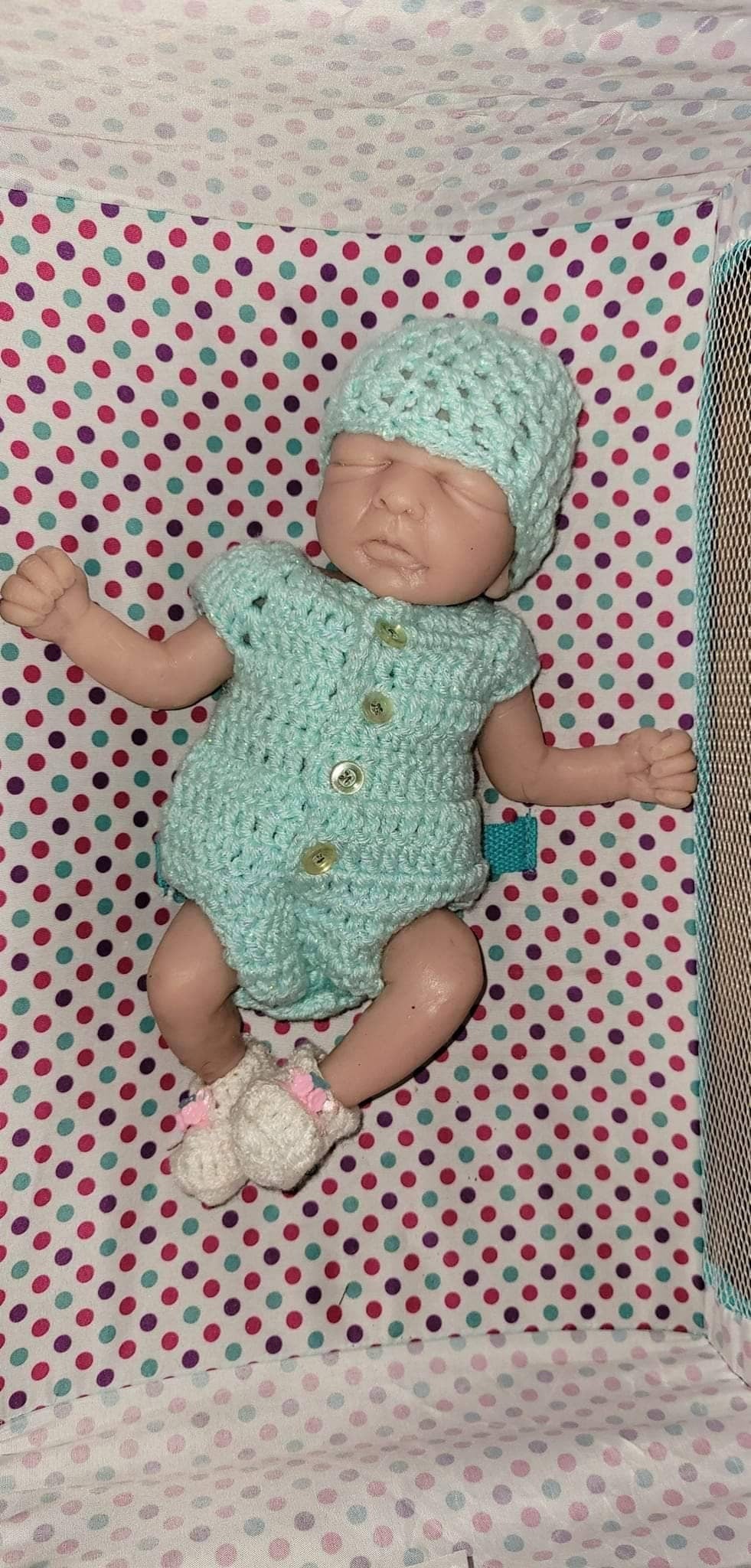 Or bottle. She is very detailed. Arns to the side. She is aprx 11" preemie. Each baby is poured custom to order selling as boo boo babies since they do have some imperfections random lumpy spots upon body nothing severe. No returns. She is not perfect and has some flaws.