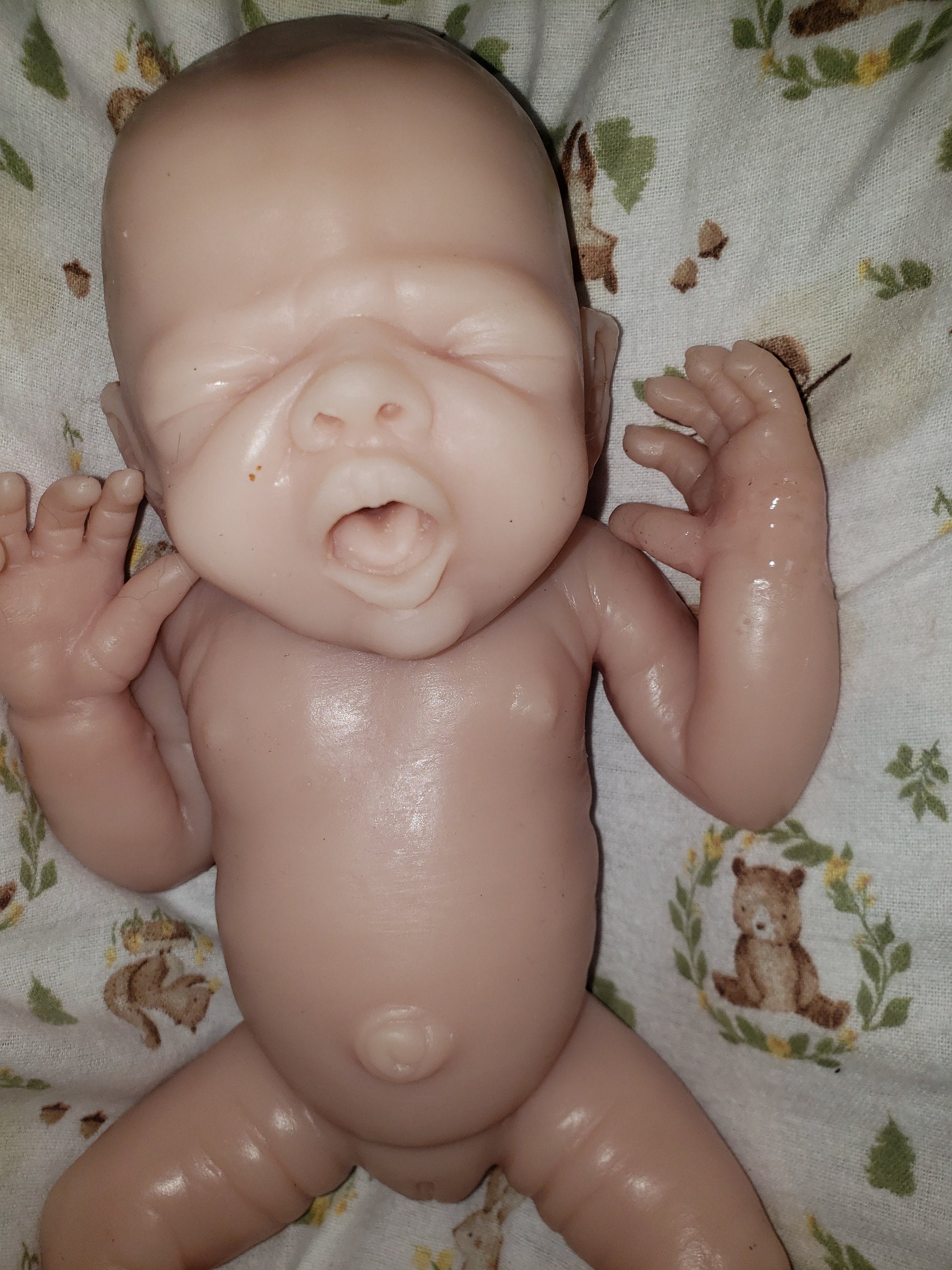 Bella is an incredibly cute and expressive baby with a pose that makes her perfect for both cuddling and posing for photos. Her realism, from her open mouth with tongue to her upward arms and soft blend, makes her a cherished addition to any silicone doll collection.