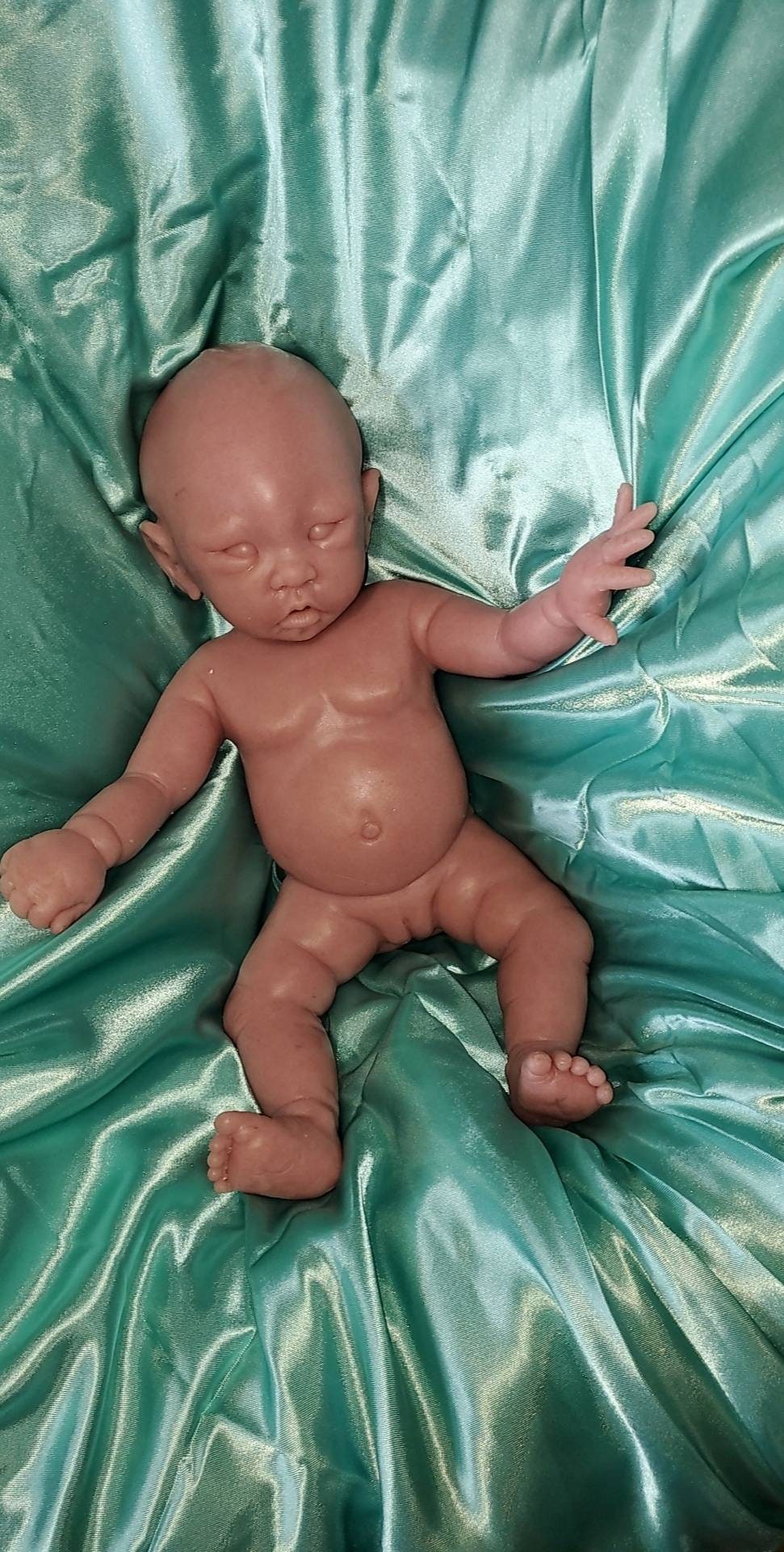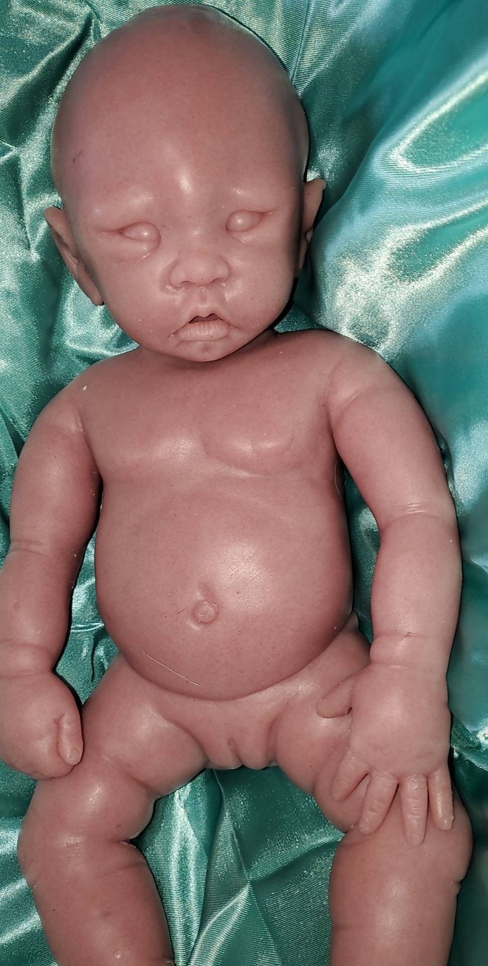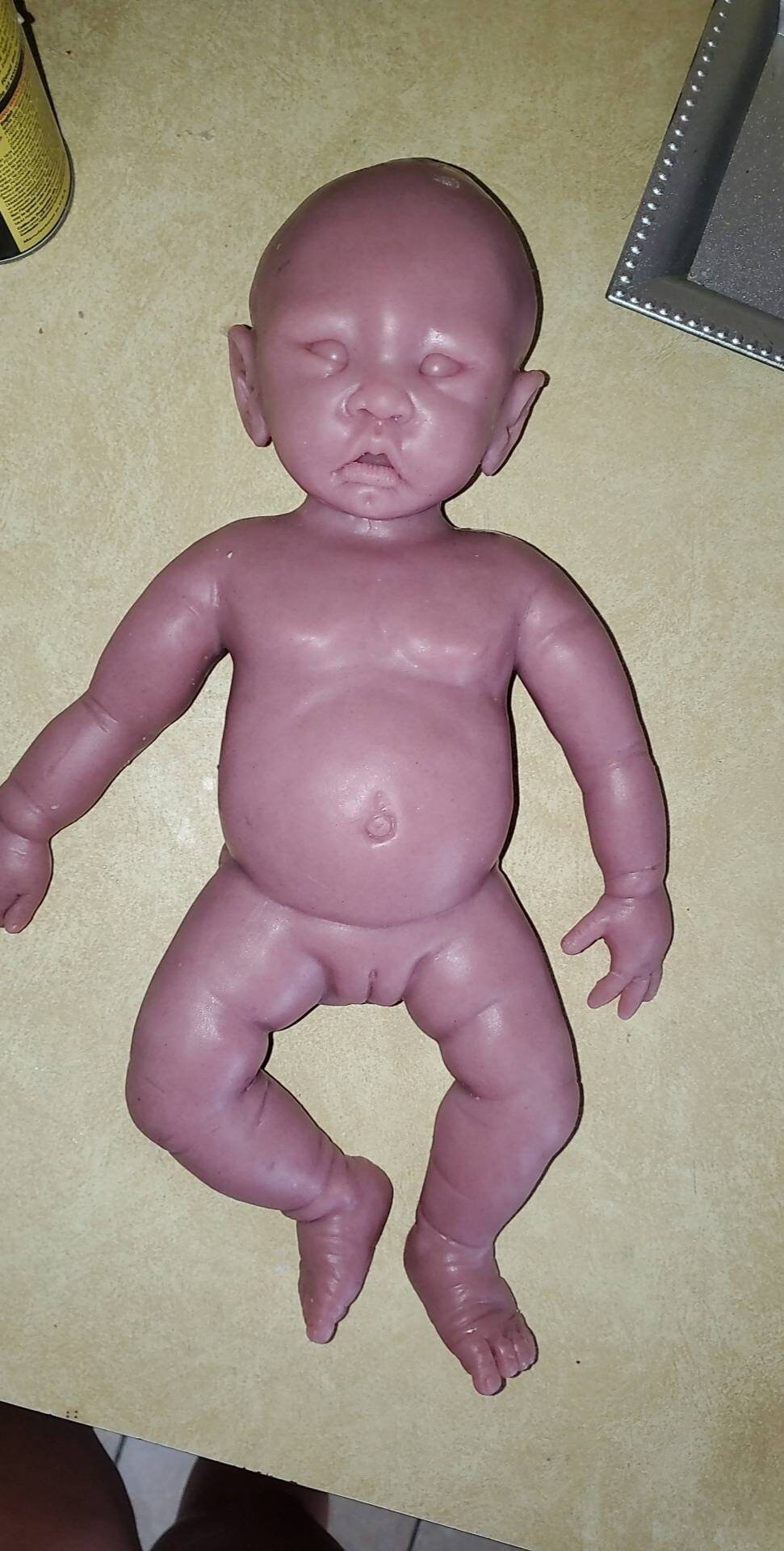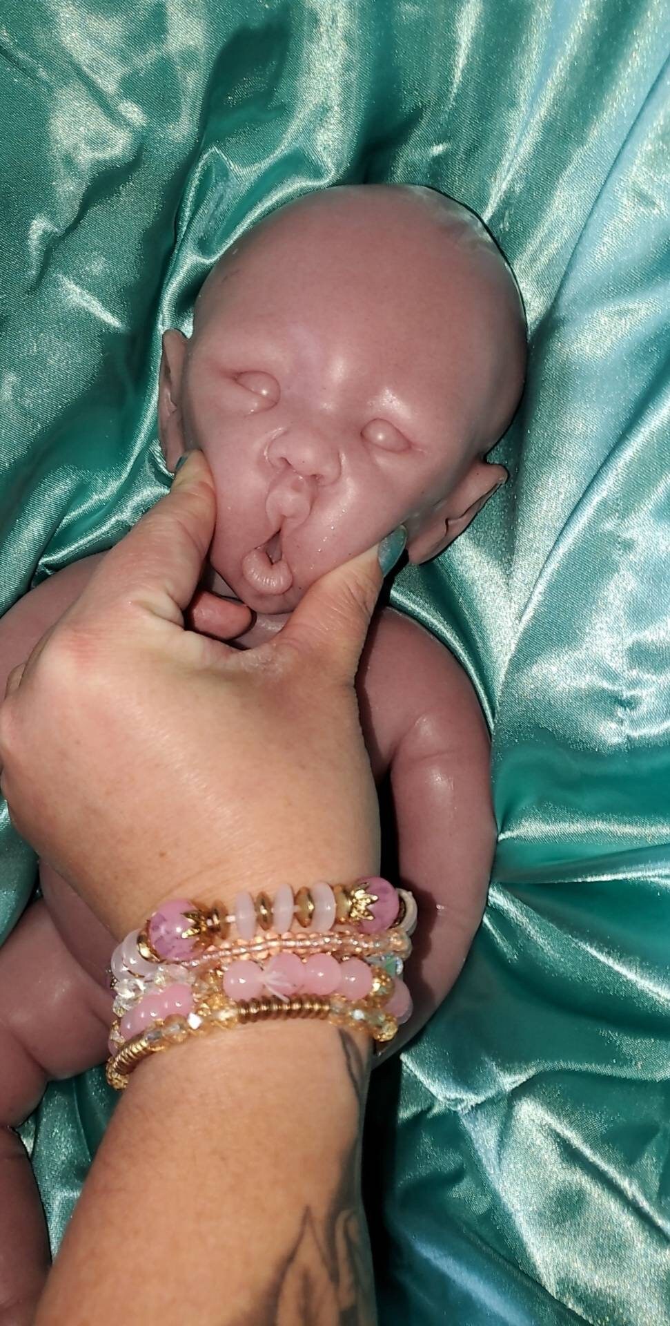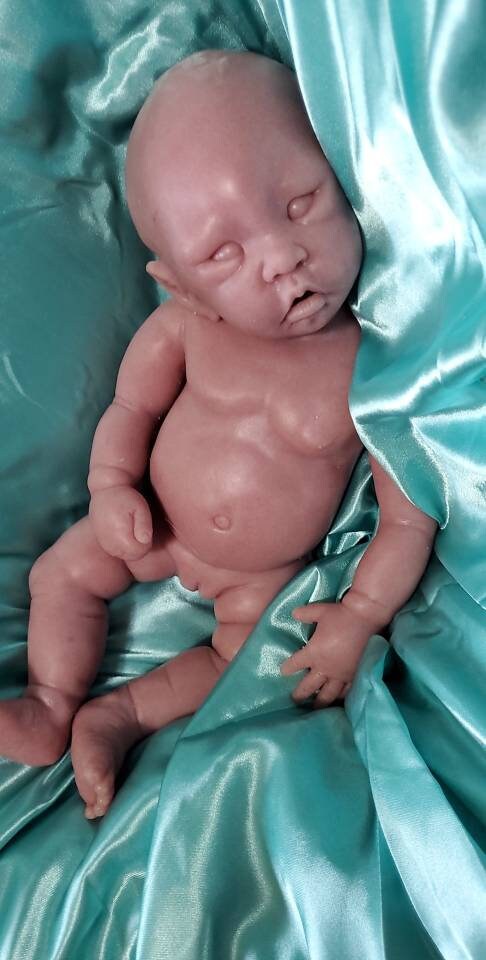 This sculpt is a small newborn size, approximately 17 inches in length, with open eyes and an open mouth that can take a full pacifier or bottle nipple. Originally sculpted by Wonderfully Made by Nae, and molded and poured by me at Valerio's Reborn Nursery.