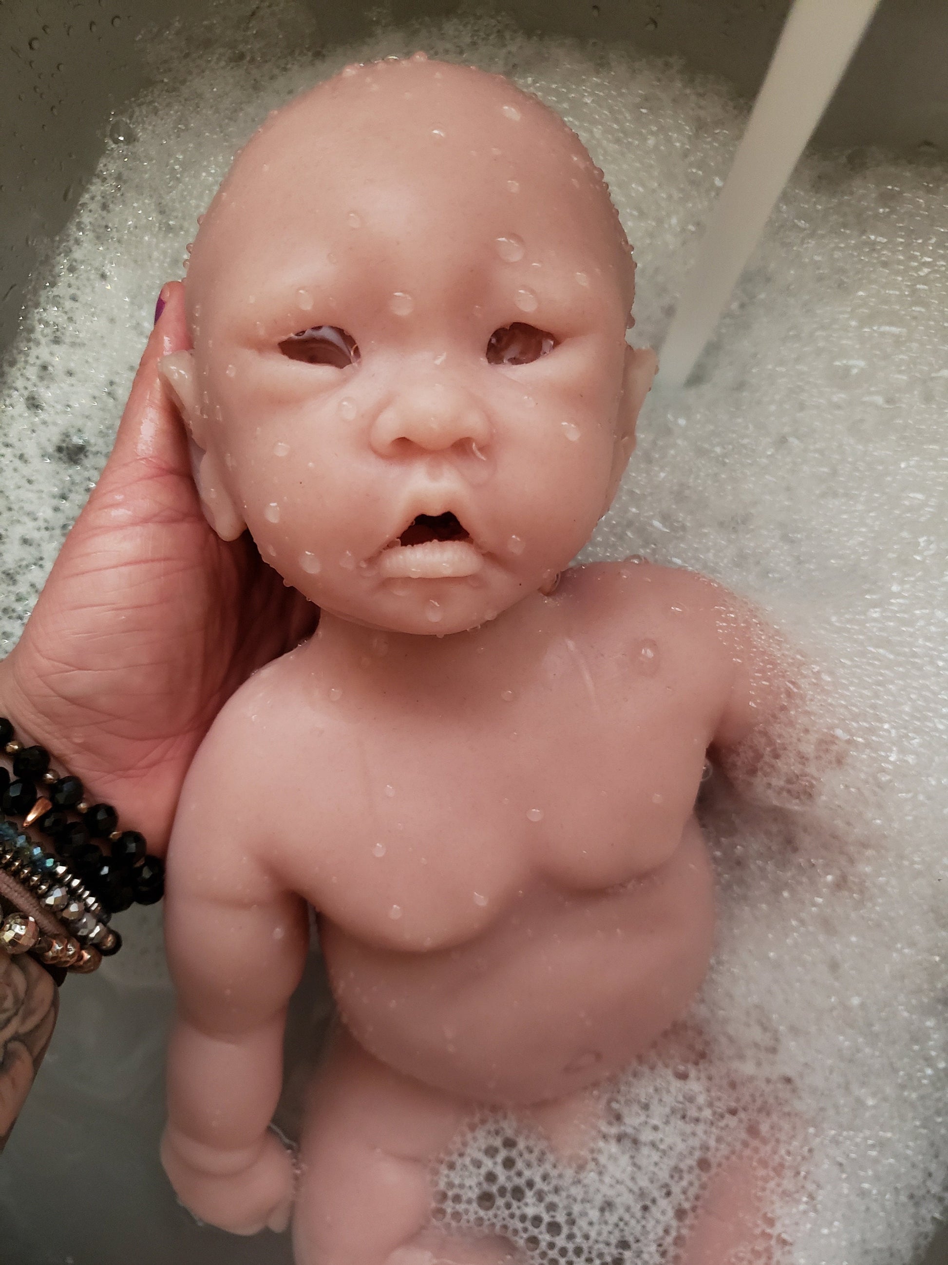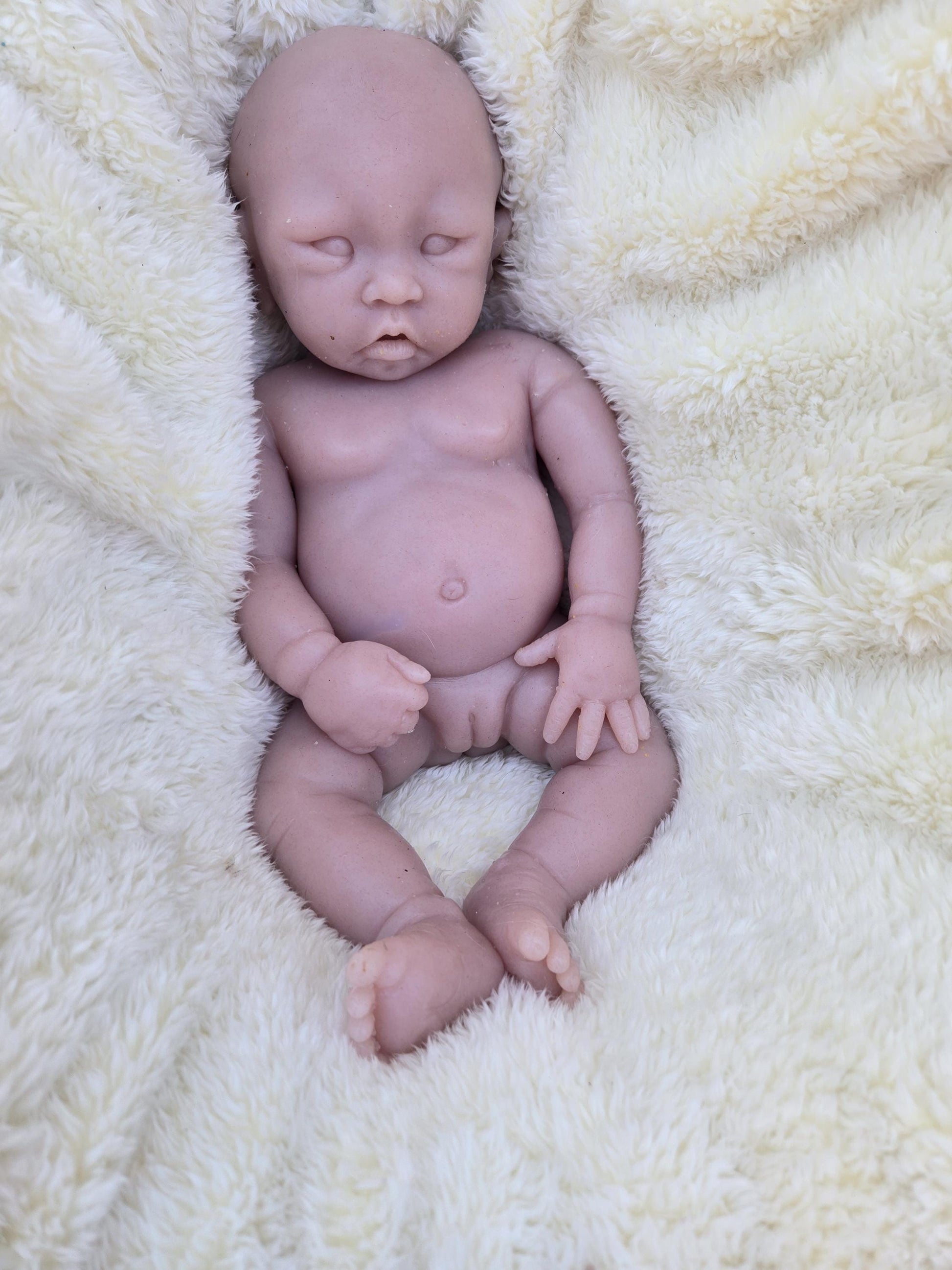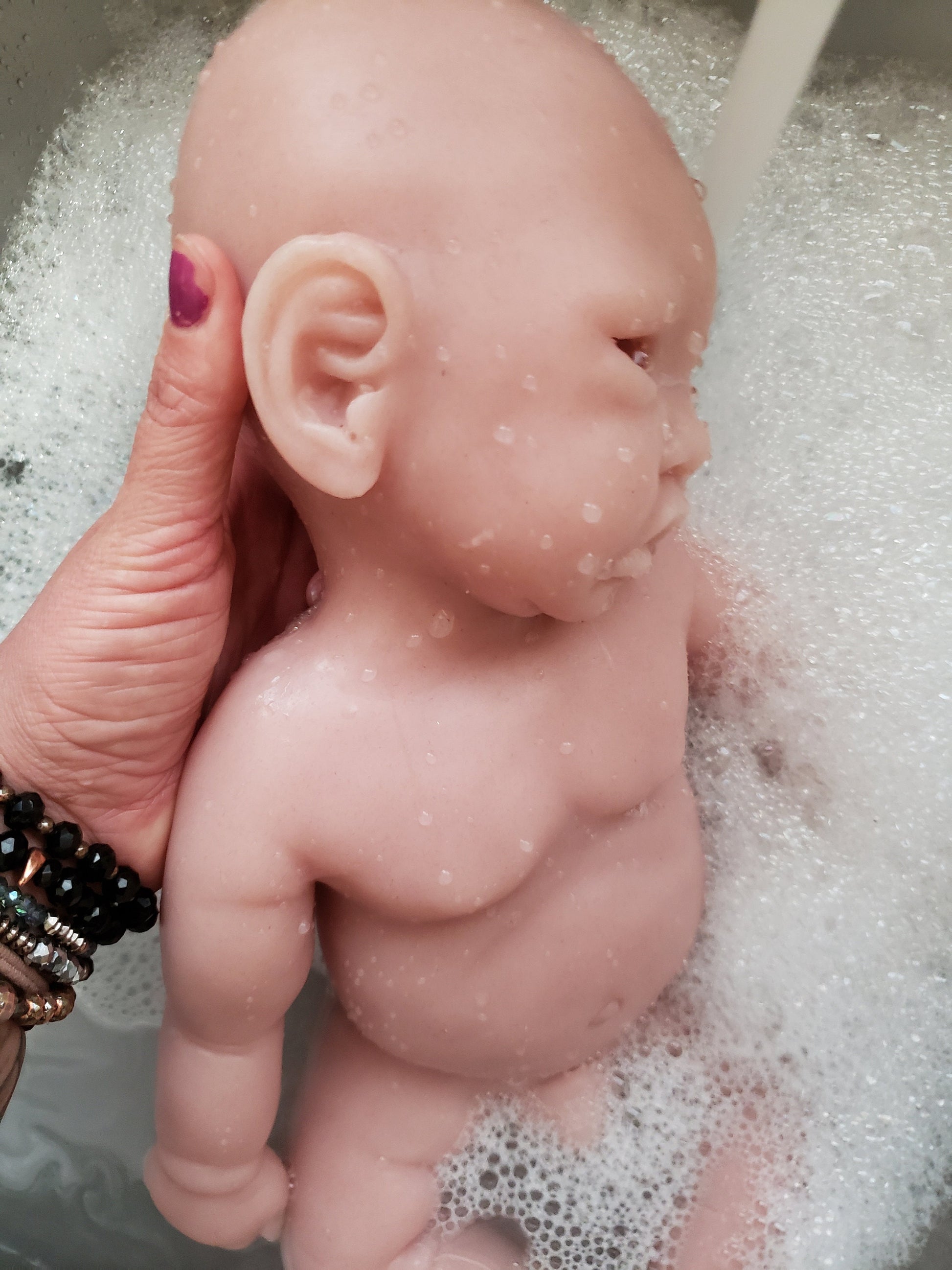 This sculpt is a small newborn size, approximately 17 inches in length, with open eyes and an open mouth that can take a full pacifier or bottle nipple. Originally sculpted by Wonderfully Made by Nae, and molded and poured by me at Valerio's Reborn Nursery.