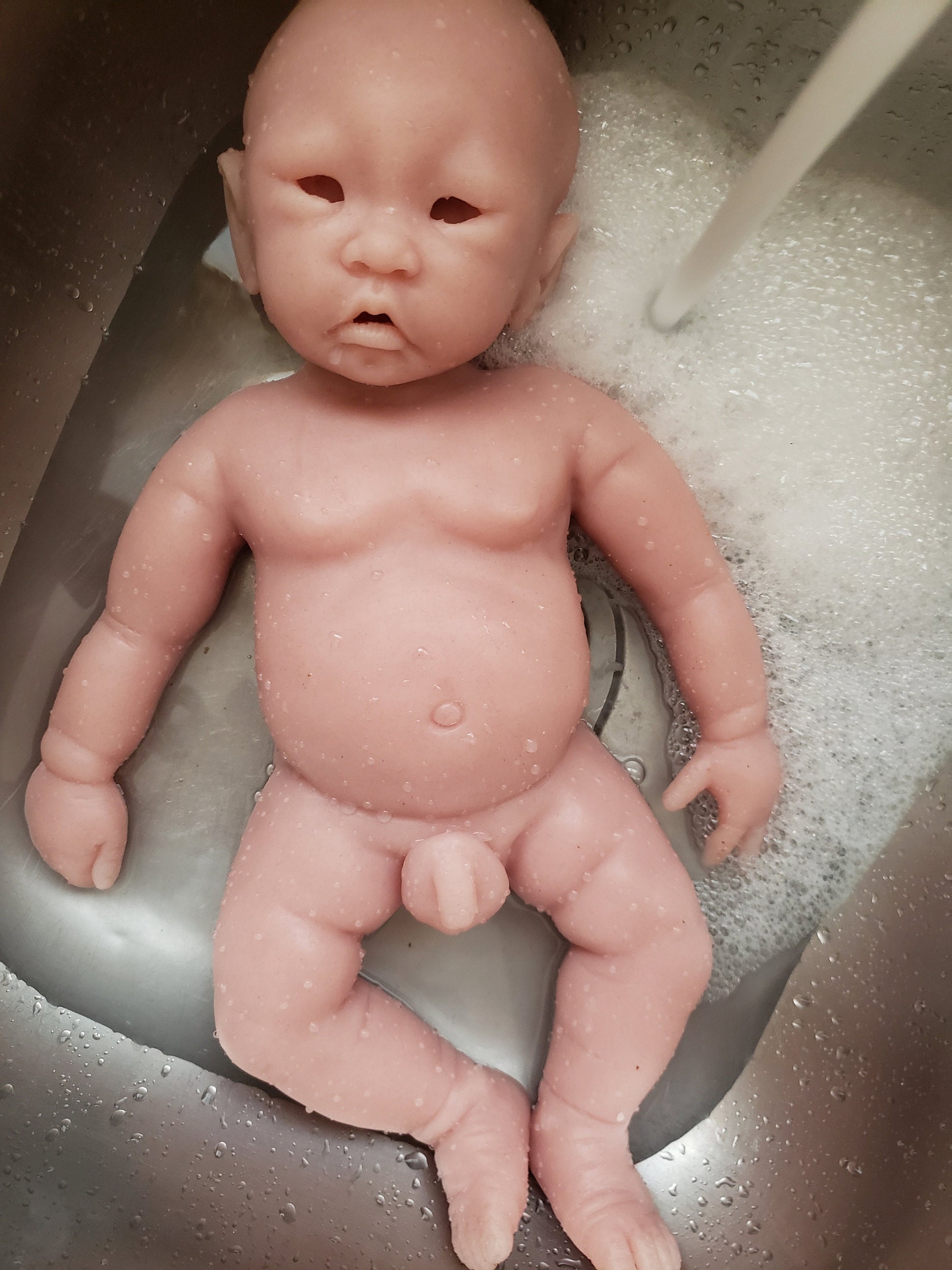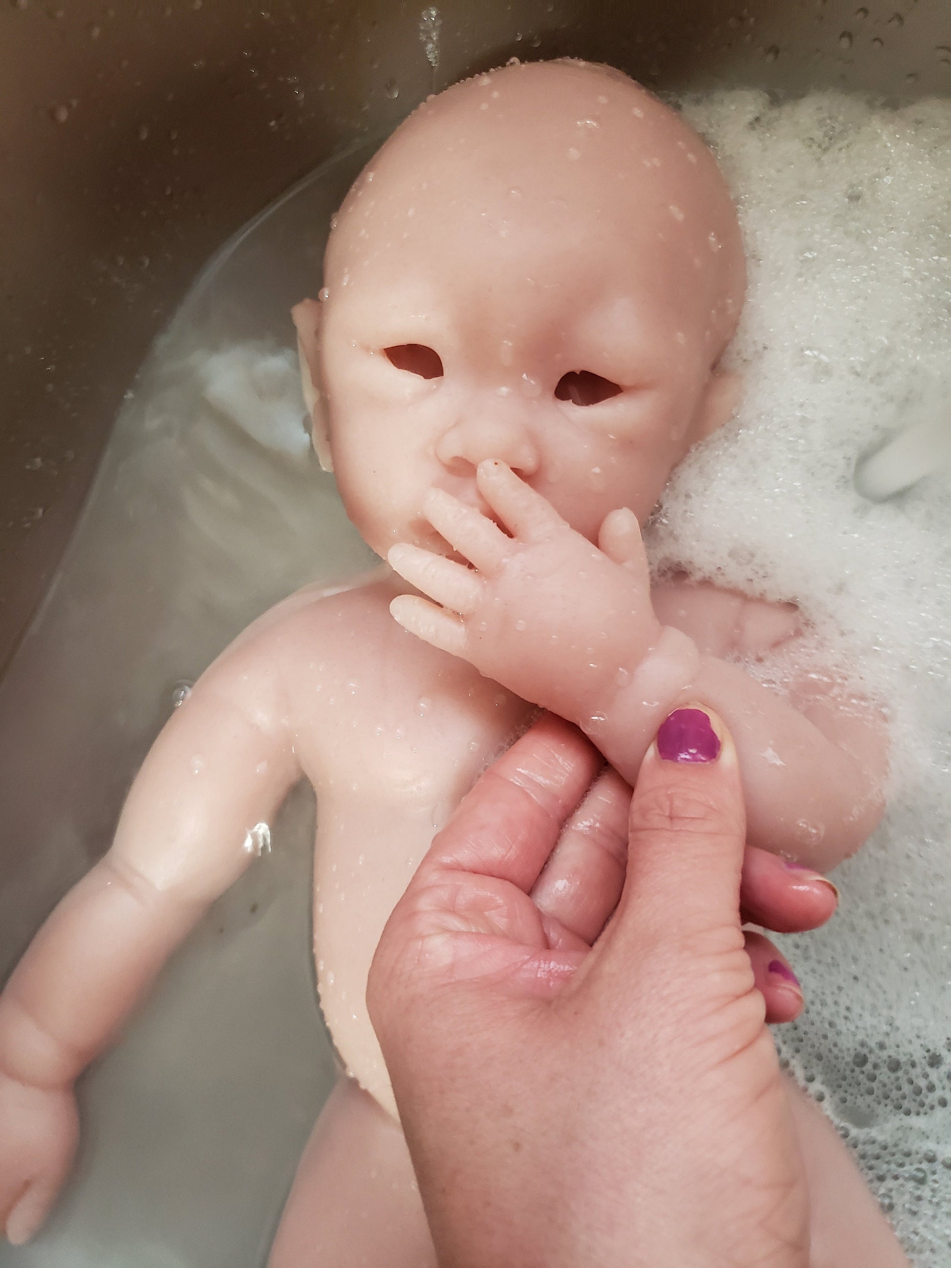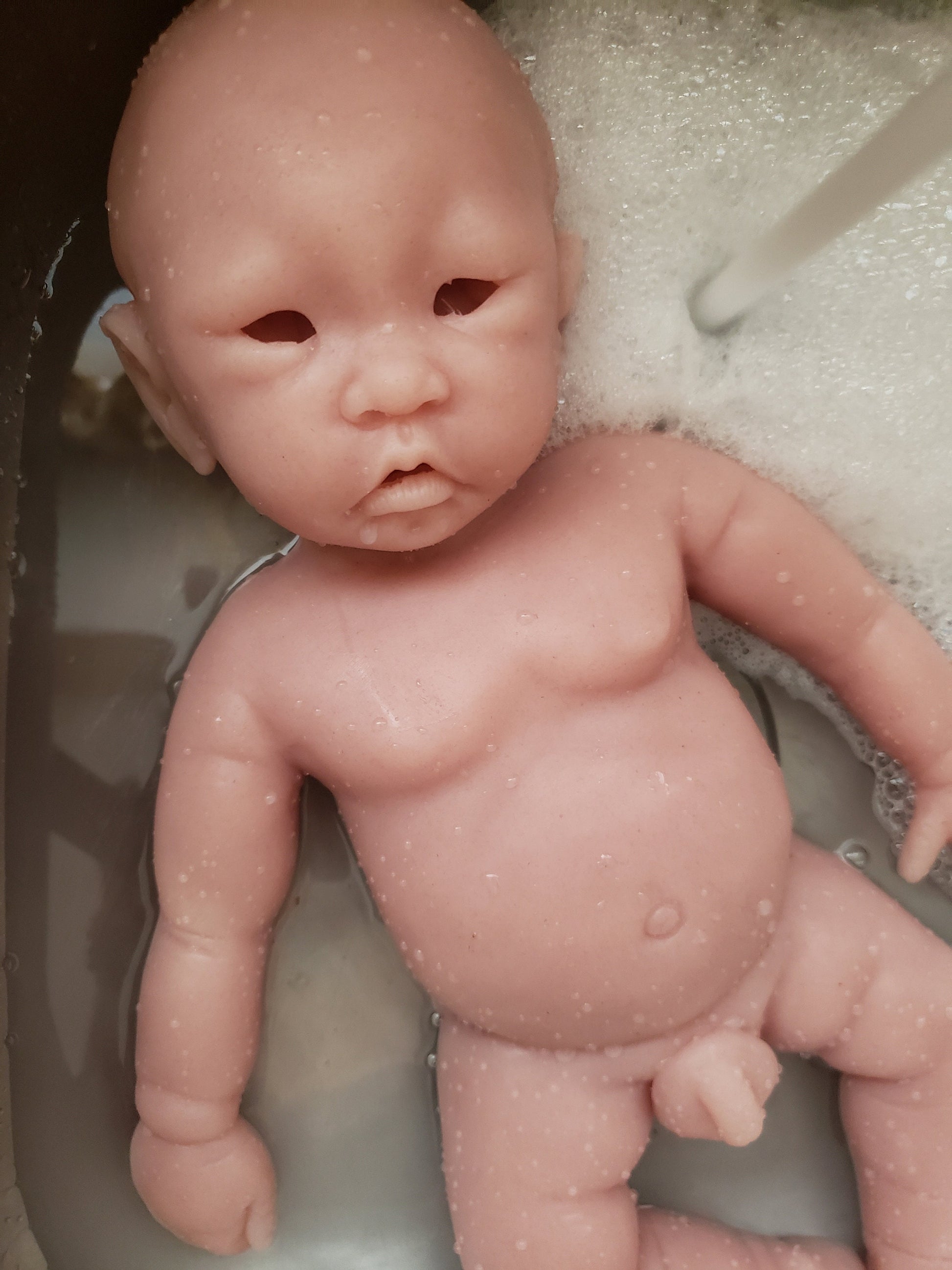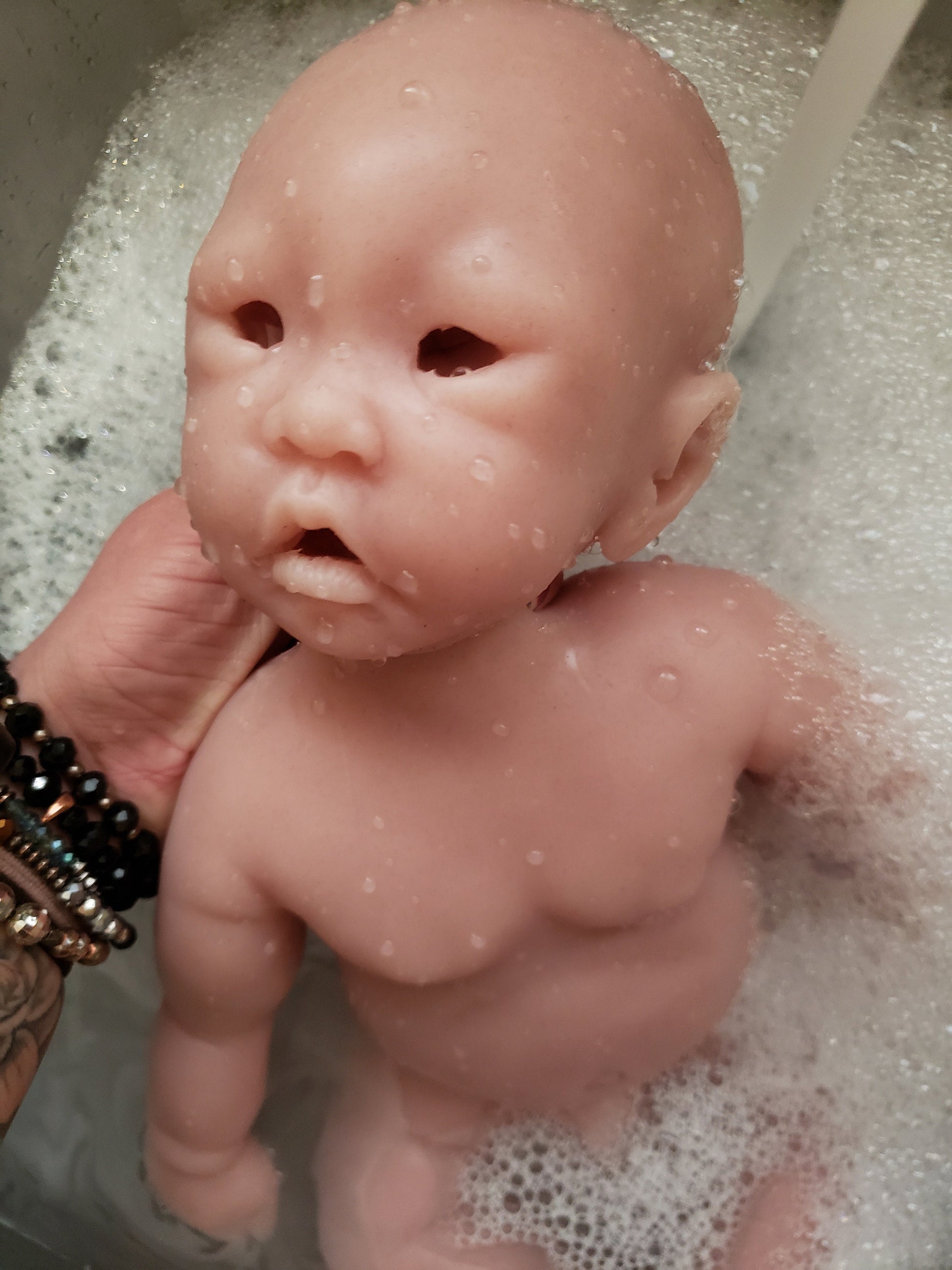 This sculpt is a small newborn size, approximately 17 inches in length, with open eyes and an open mouth that can take a full pacifier or bottle nipple. Originally sculpted by Wonderfully Made by Nae, and molded and poured by me at Valerio's Reborn Nursery.