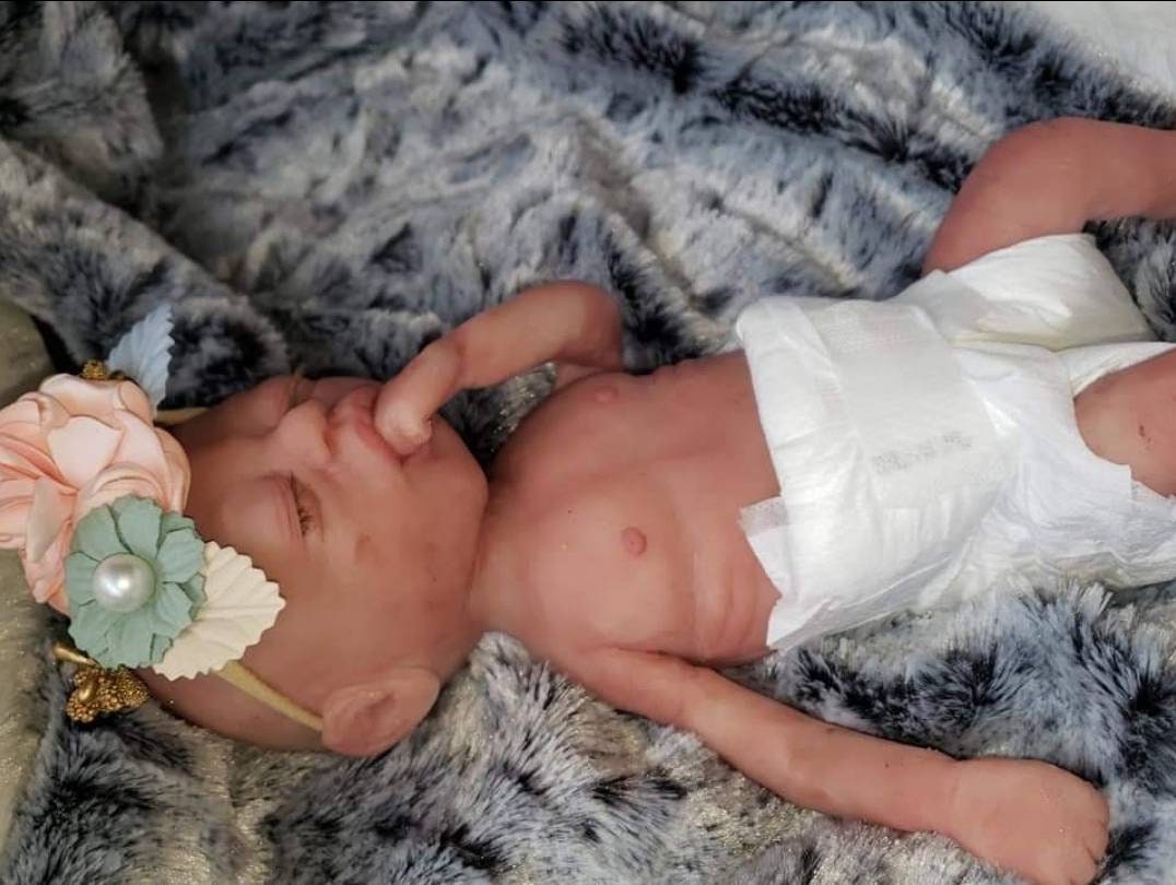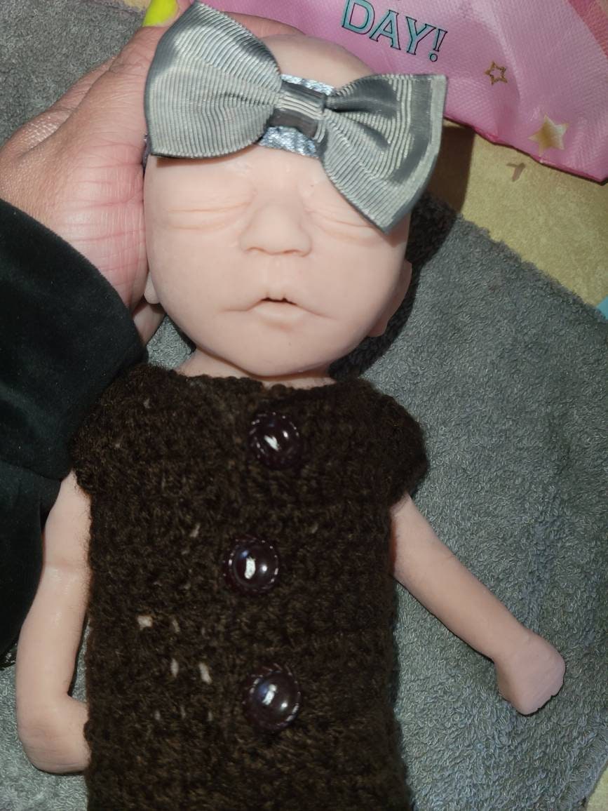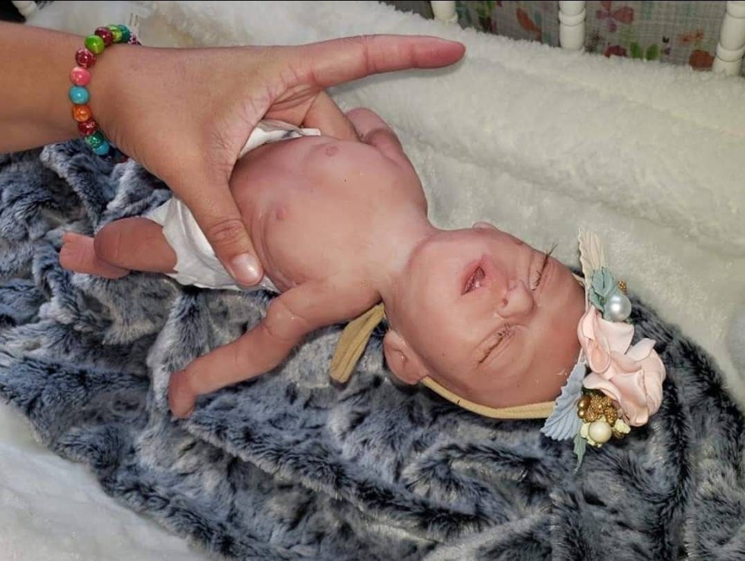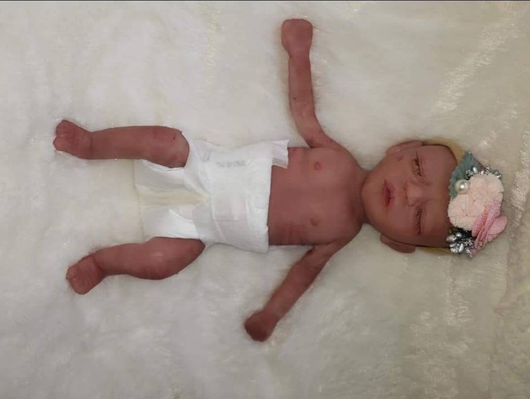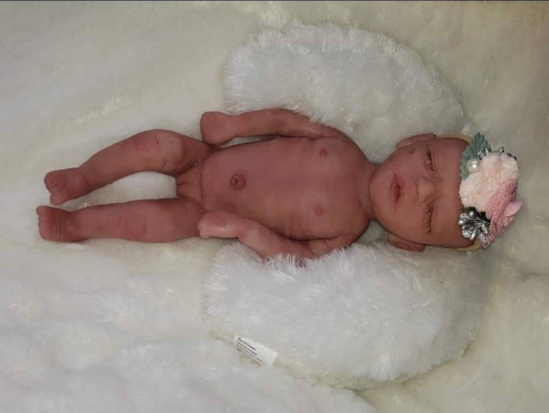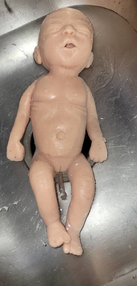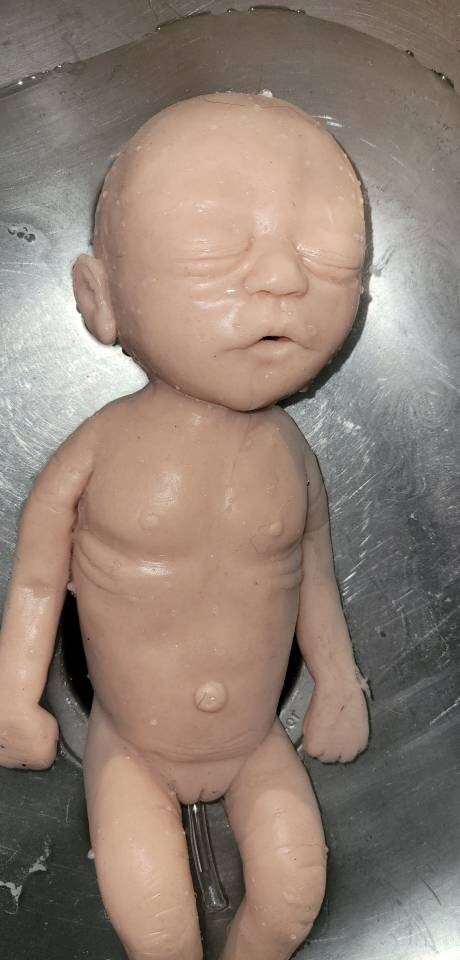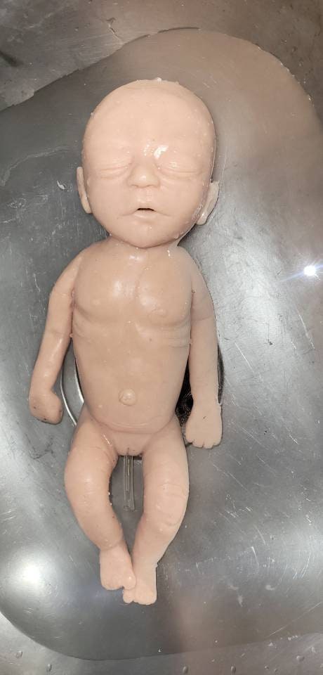 Will be poured from soft eco flex blend silicone that is very soft. you can choose to have poured in marshmallow blend for $50 extra. . You can also choose skin tone. Blank or fully painted. Bald or rooted hair. She has closed eyes but they can be opened upon request for $25 extra. This is a custom pour, no returns.