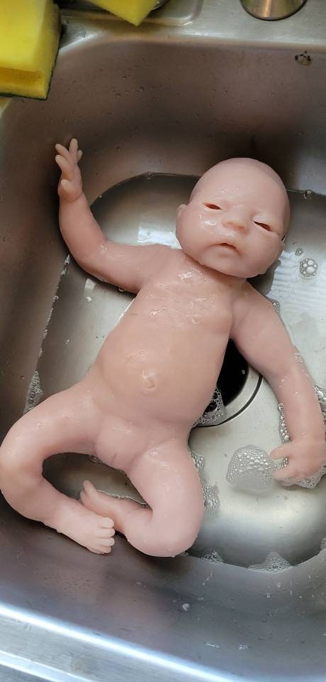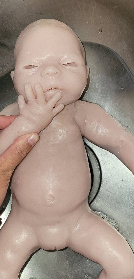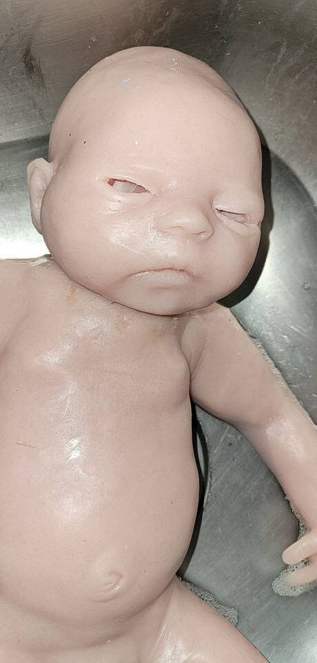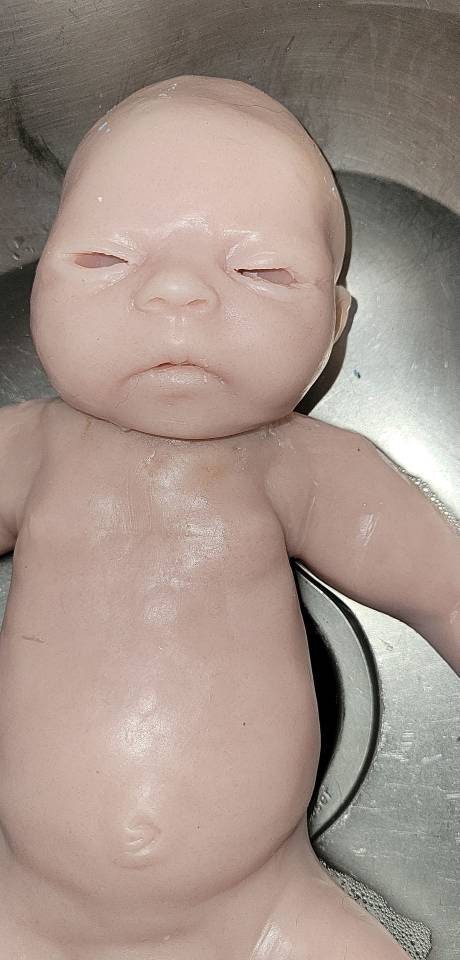 Poured from eco flex 10 it is very soft squishy and flexible. This baby is seamless but head is attached afterwards. May have slight imperfections since it's hand made but it's very smooth and nice there is no such thing as perfect t but this is as close as it gets! Very cute baby girl or can be boy can have drink n wet added. Will come with extras. You choose as blank or fully painted and hair rooted or bald. If you choose to have painted you can view my recent work at valerio's reborn nursery via Facebook I work to make the perfect baby for you as to your liking from every little detail to skin tone color, birth marks, baby acne, beauty marks, blushing, if you want mottling etc or you can send me a pic of another baby you like and I can do my best to match the paint! I always stay in touch with customers eith photos as well if you choose to have fully painted. I noticed this baby does not have much of a neck but most people don't worry about that still such a cutie and doesn't make a difference just has to be stated before sales are made thank you