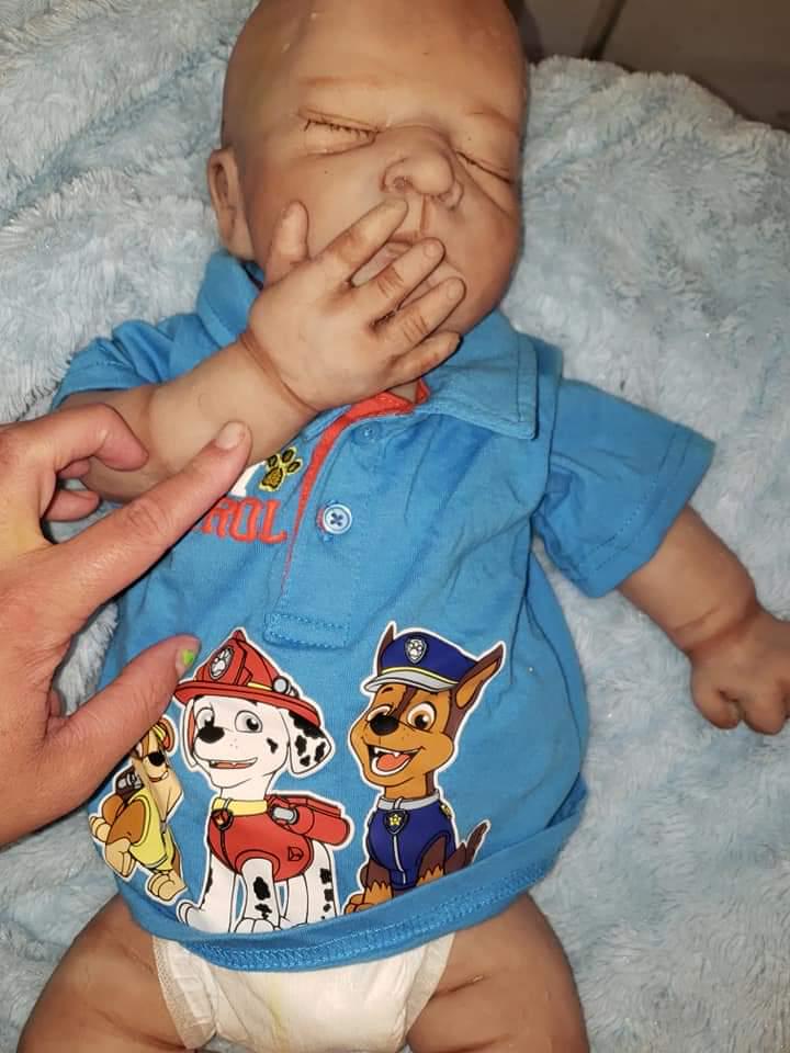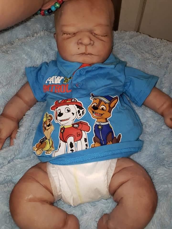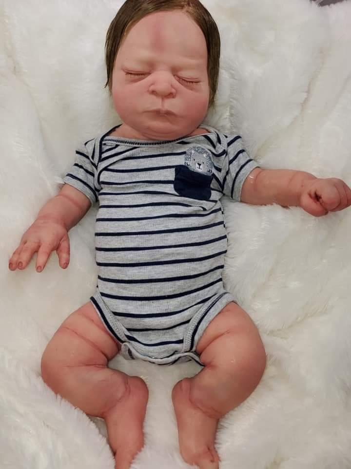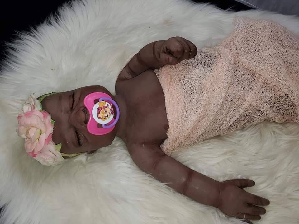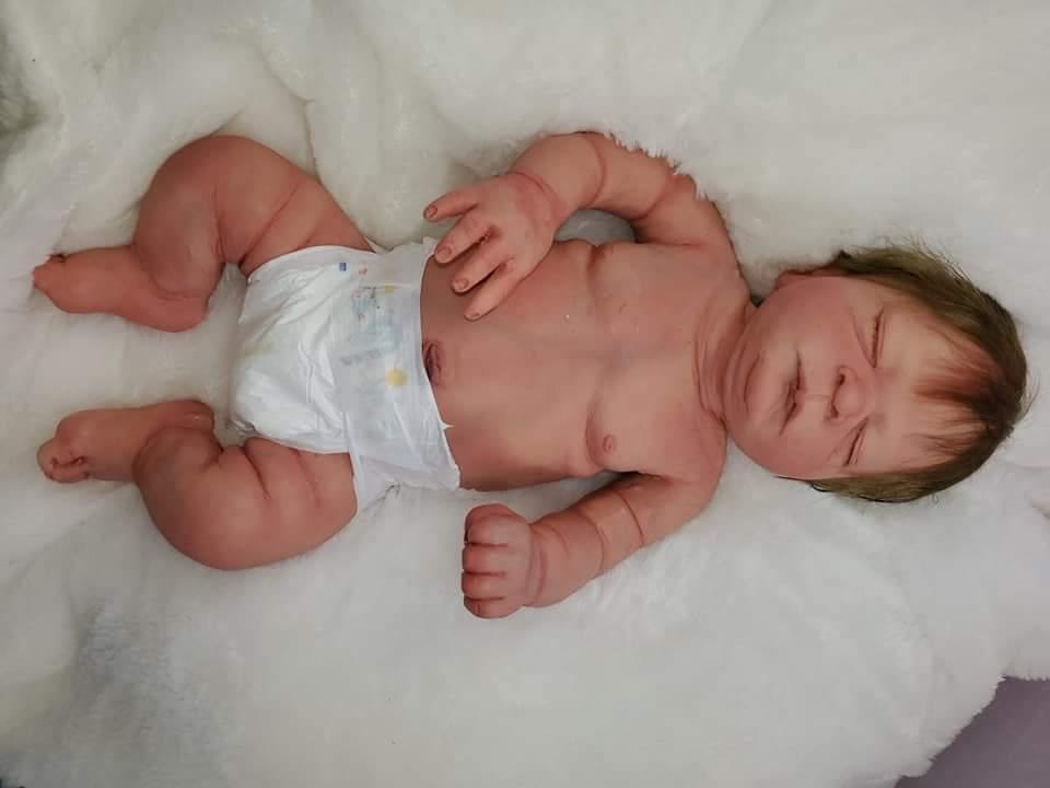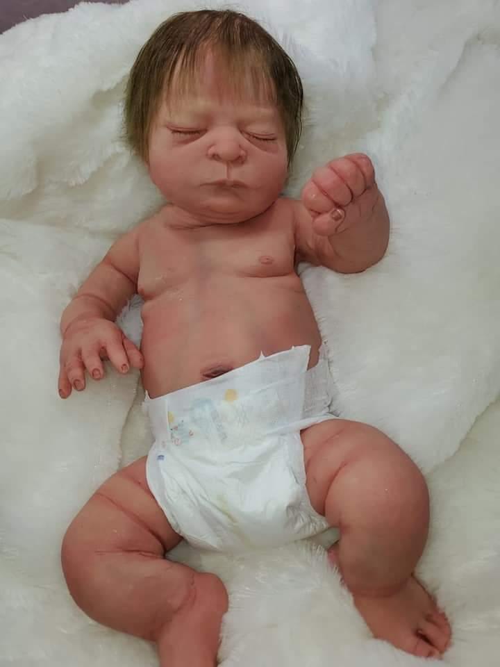 She is a closed eye Baby will have open mouth. She is very big and fits 3 month size clothing, can be a Boy or girl. Blank or un painted. If you have a certain painting style you are wanting you can send me photos and I can do my best to match the same style of painting. You can get any custom details added as well as birth marks, baby ance, veining etc. This baby is not perfect She has some places on her body that don't look as smooth as the front side of her (one toe is lumpy ,pour spout that is covered I try my best to fix all I'm perfections but since these babies are hand made from start to finish they are not perfect in any way. She will come with extras. I do not offer returns as I have to pay out of pocket to buy the silicone and all the products to make this baby thank you