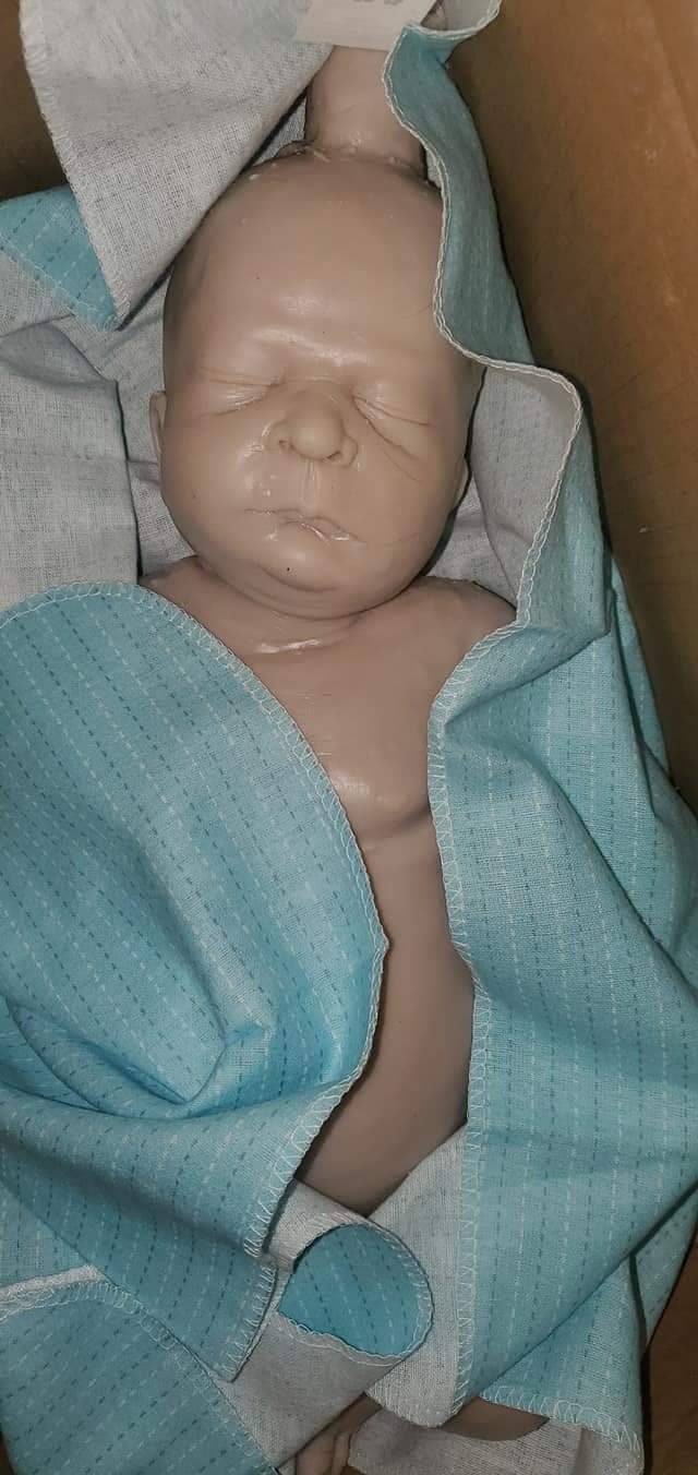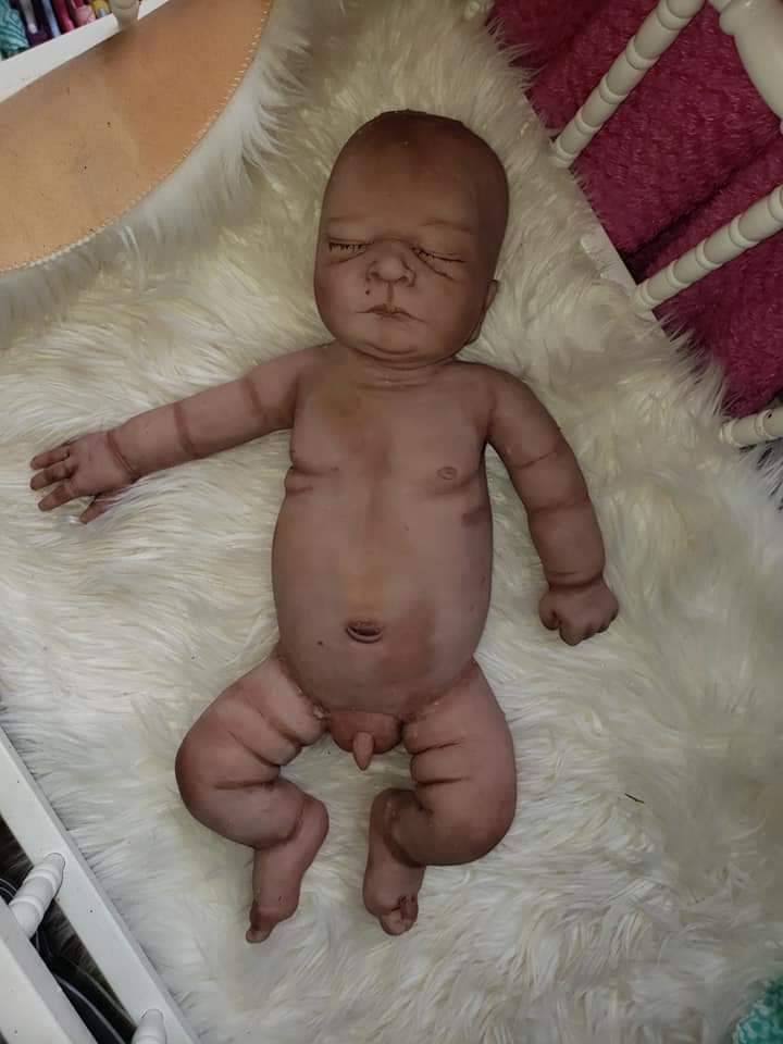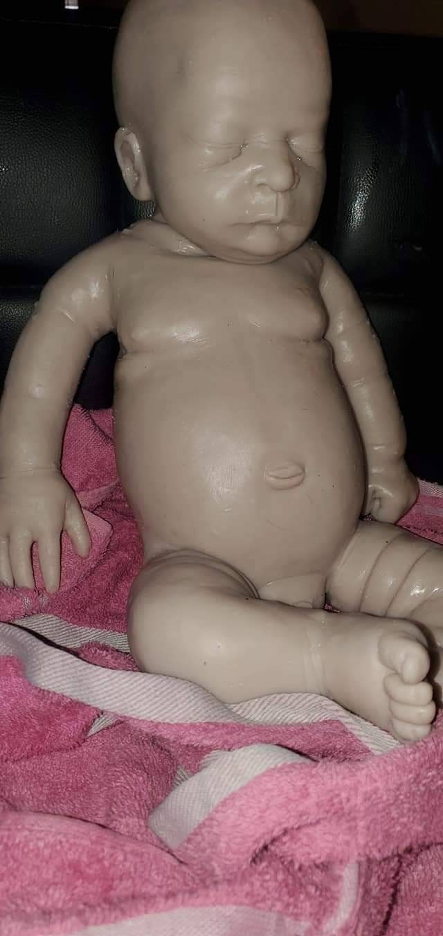 She is a closed eye Baby will have open mouth. She is very big and fits 3 month size clothing, can be a Boy or girl. Blank or un painted. If you have a certain painting style you are wanting you can send me photos and I can do my best to match the same style of painting. You can get any custom details added as well as birth marks, baby ance, veining etc. This baby is not perfect She has some places on her body that don't look as smooth as the front side of her (one toe is lumpy and there Is random spots on body but not a ton ,pour spout that is covered I try my best to fix all I'm perfections but since these babies are hand made from start to finish they are not perfect in any way. She will come with extras. I do not offer returns as I have to pay out of pocket to buy the silicone and all the products to make this baby thank you