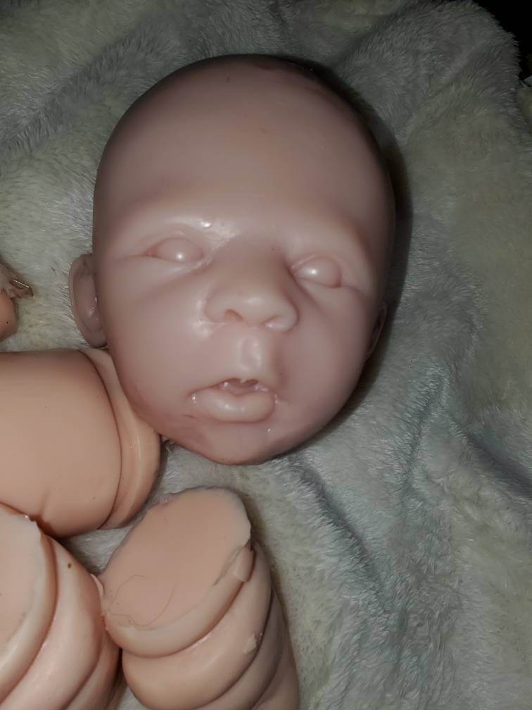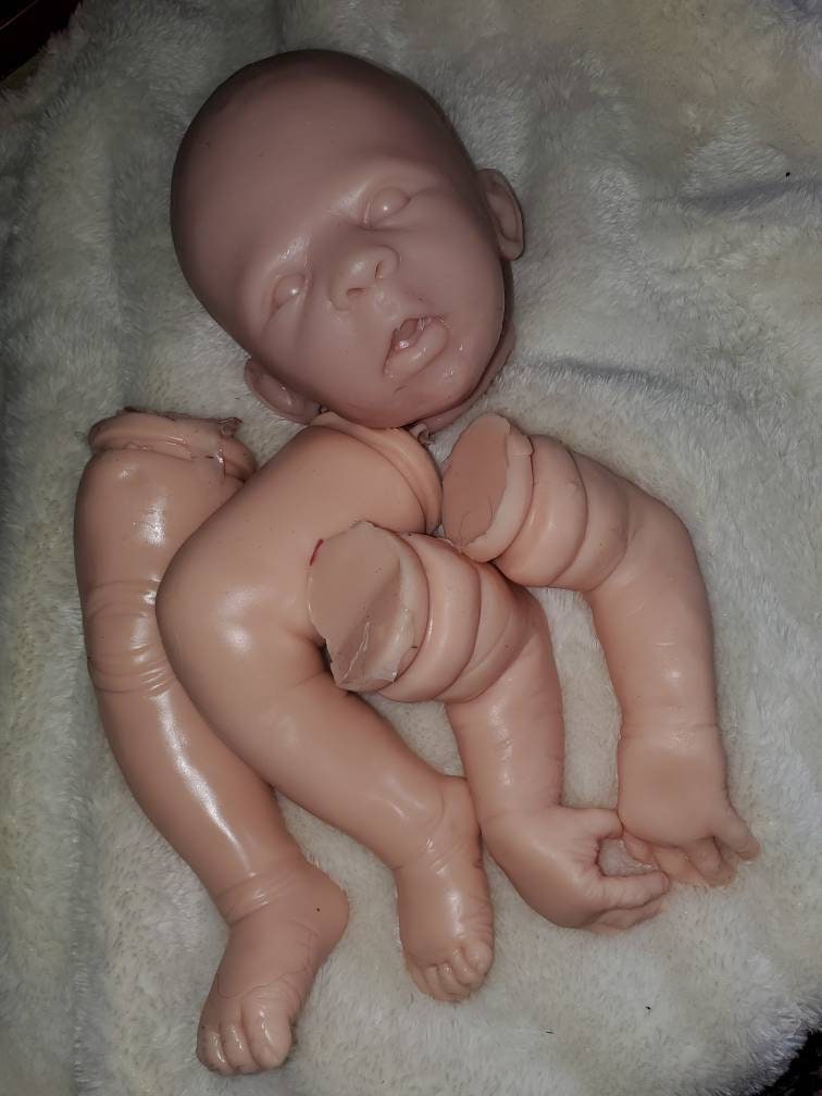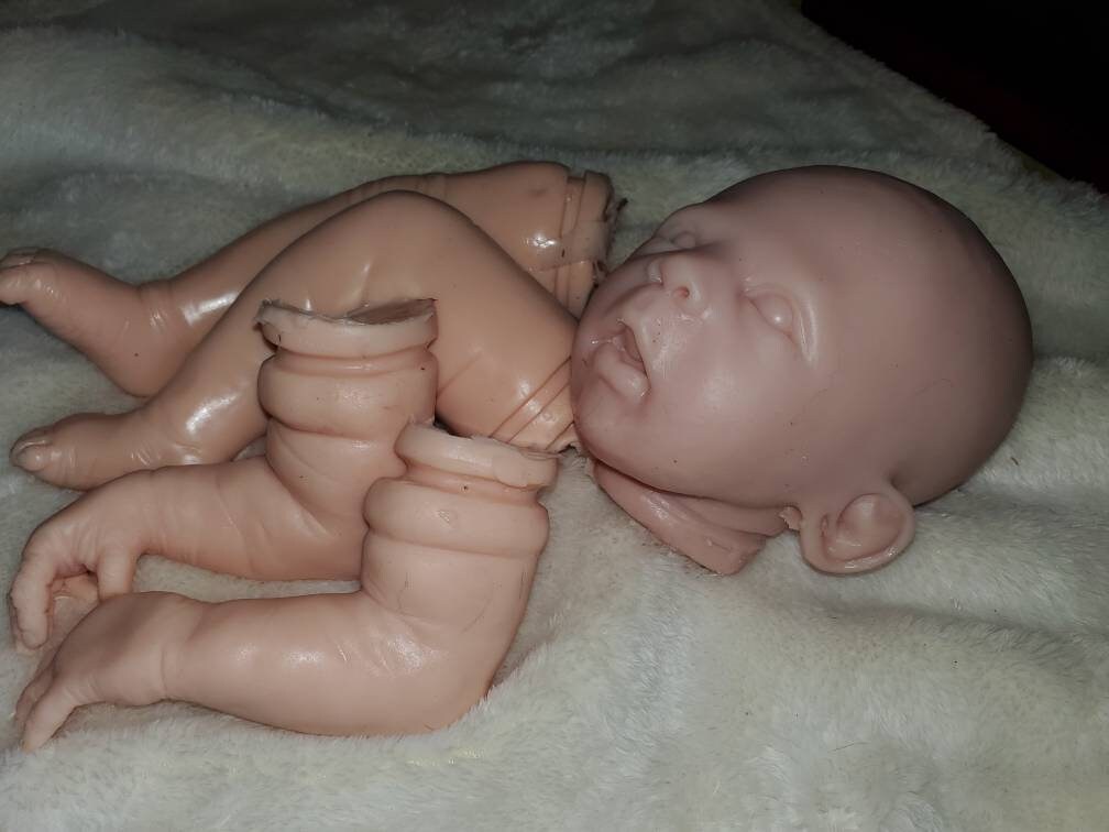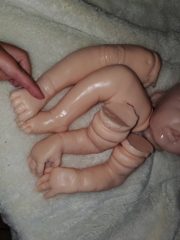 Poured in soft blend eco flex silicone. Limbs are very flexible. Head is open eye baby. This makes a 22"-24" baby complete with a body depending what size you choose. This does not include a cloth body. No returns
