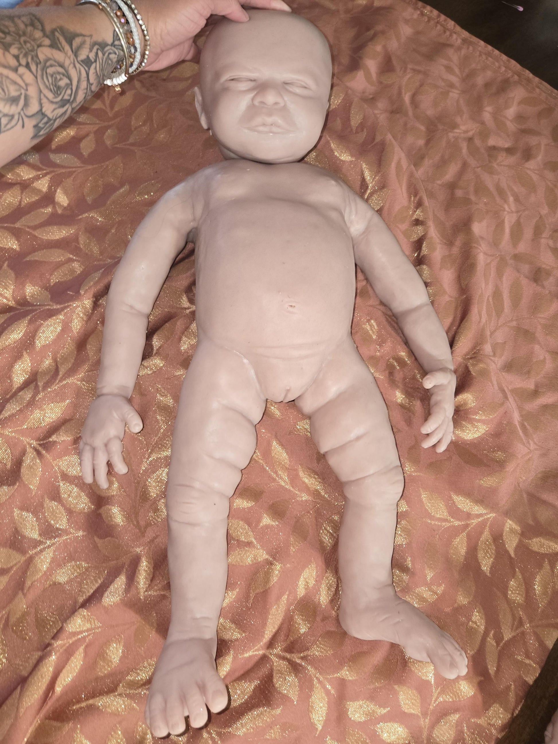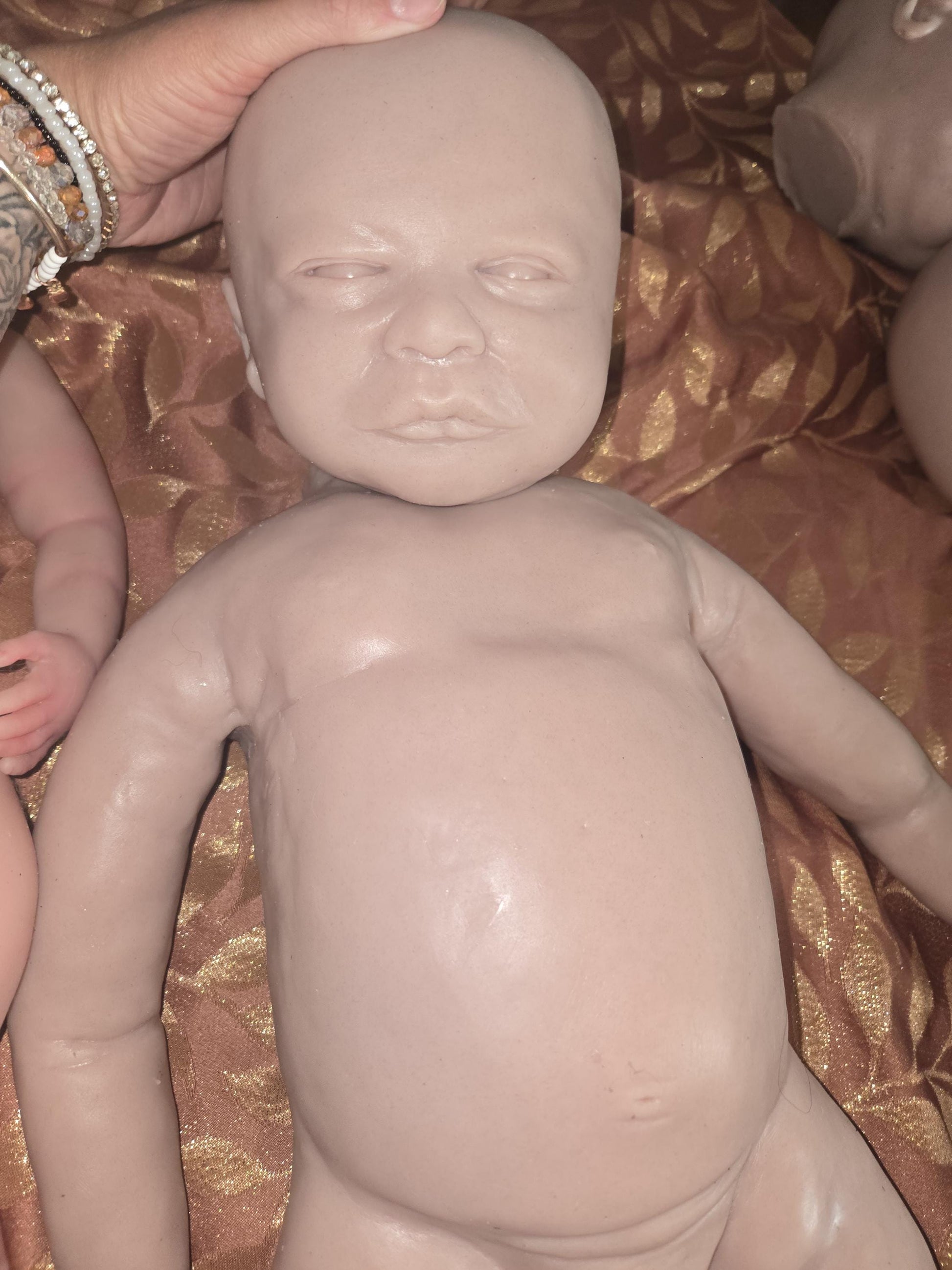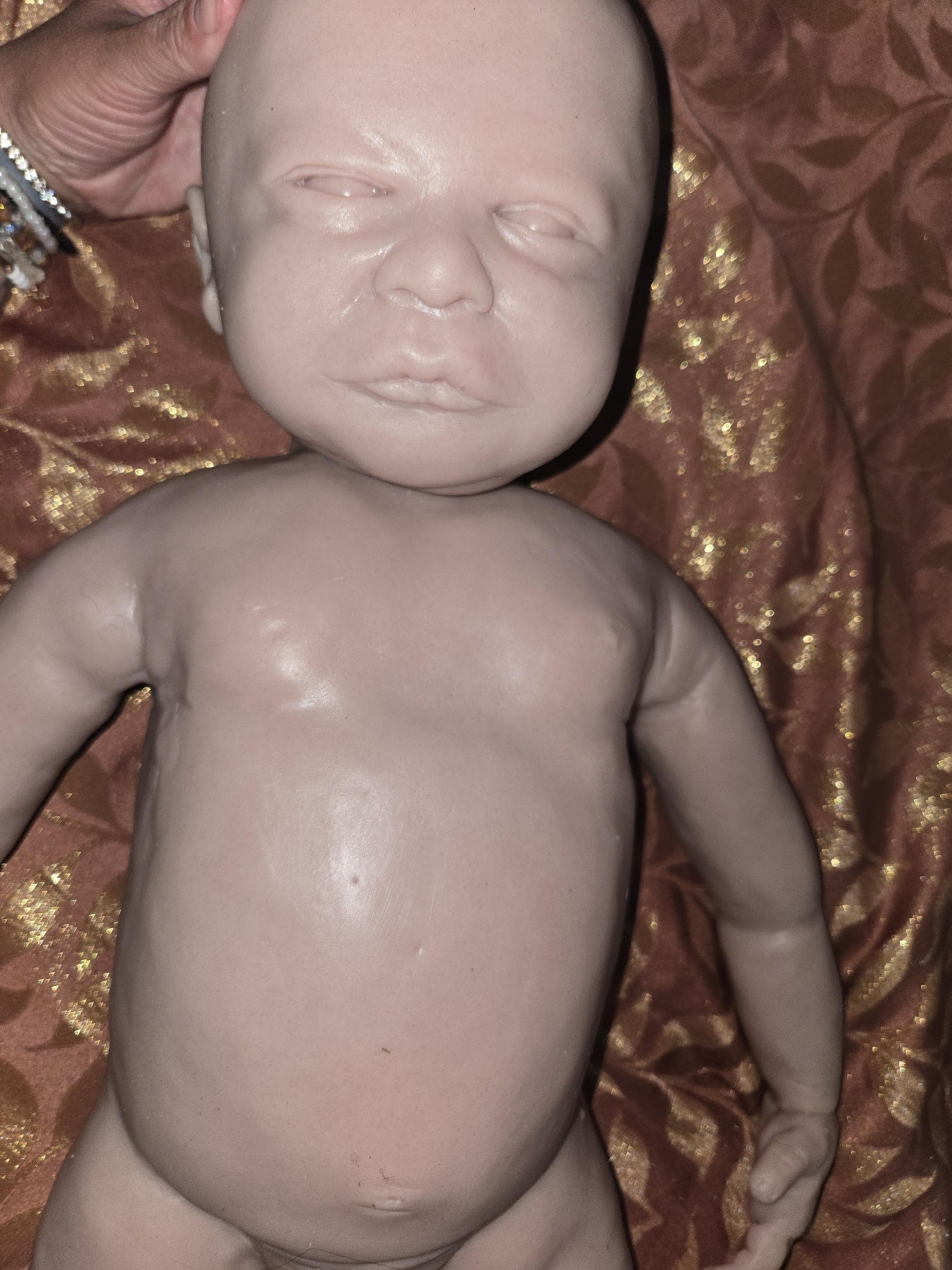 This little one is made from a flawless, seamless mold with beautifully smooth skin—no body seams The head is attached after pouring and you have three head options to choose from: two open-eyed and one sleeping. May have slight imperfections around neck area possibly.