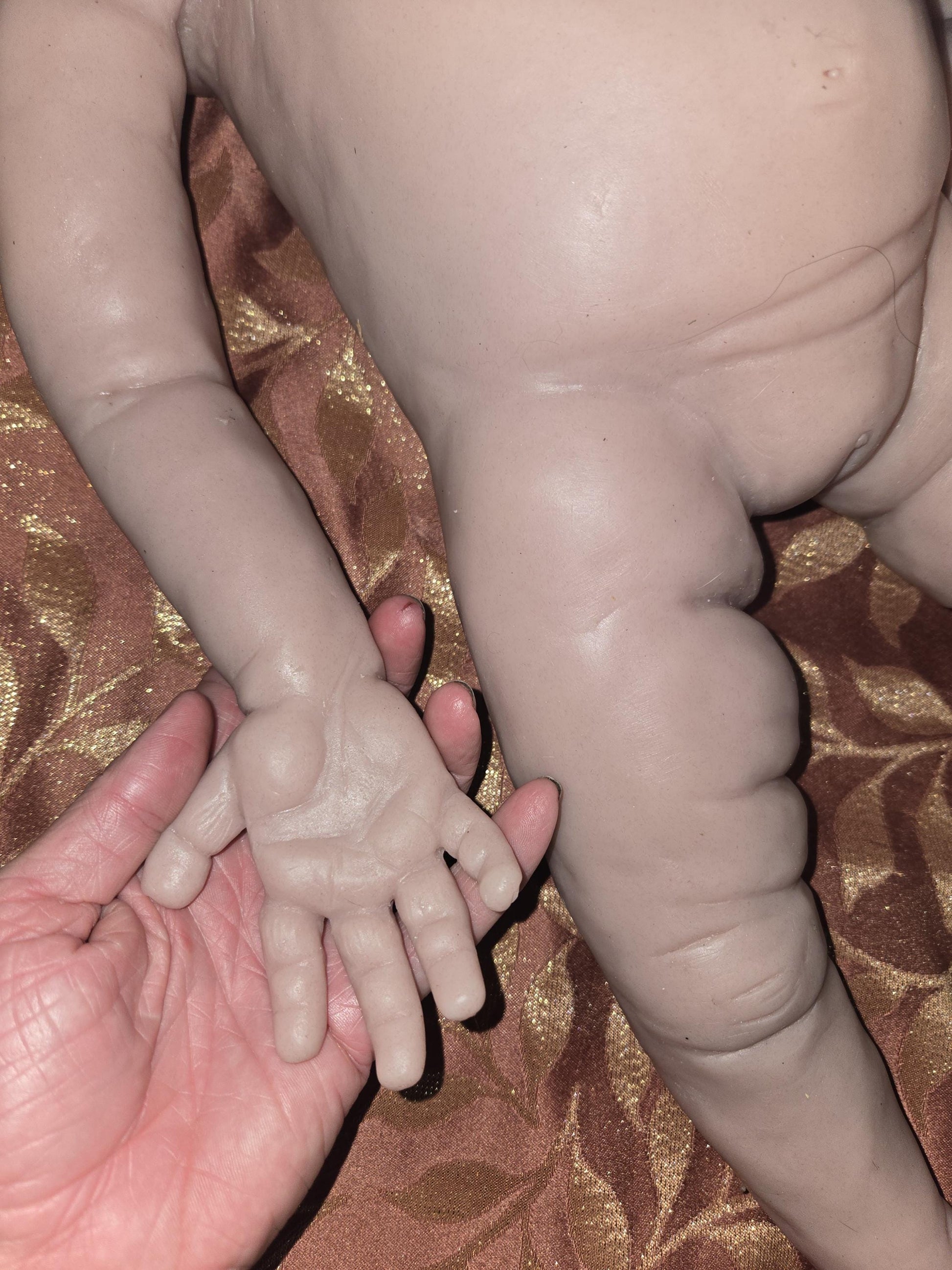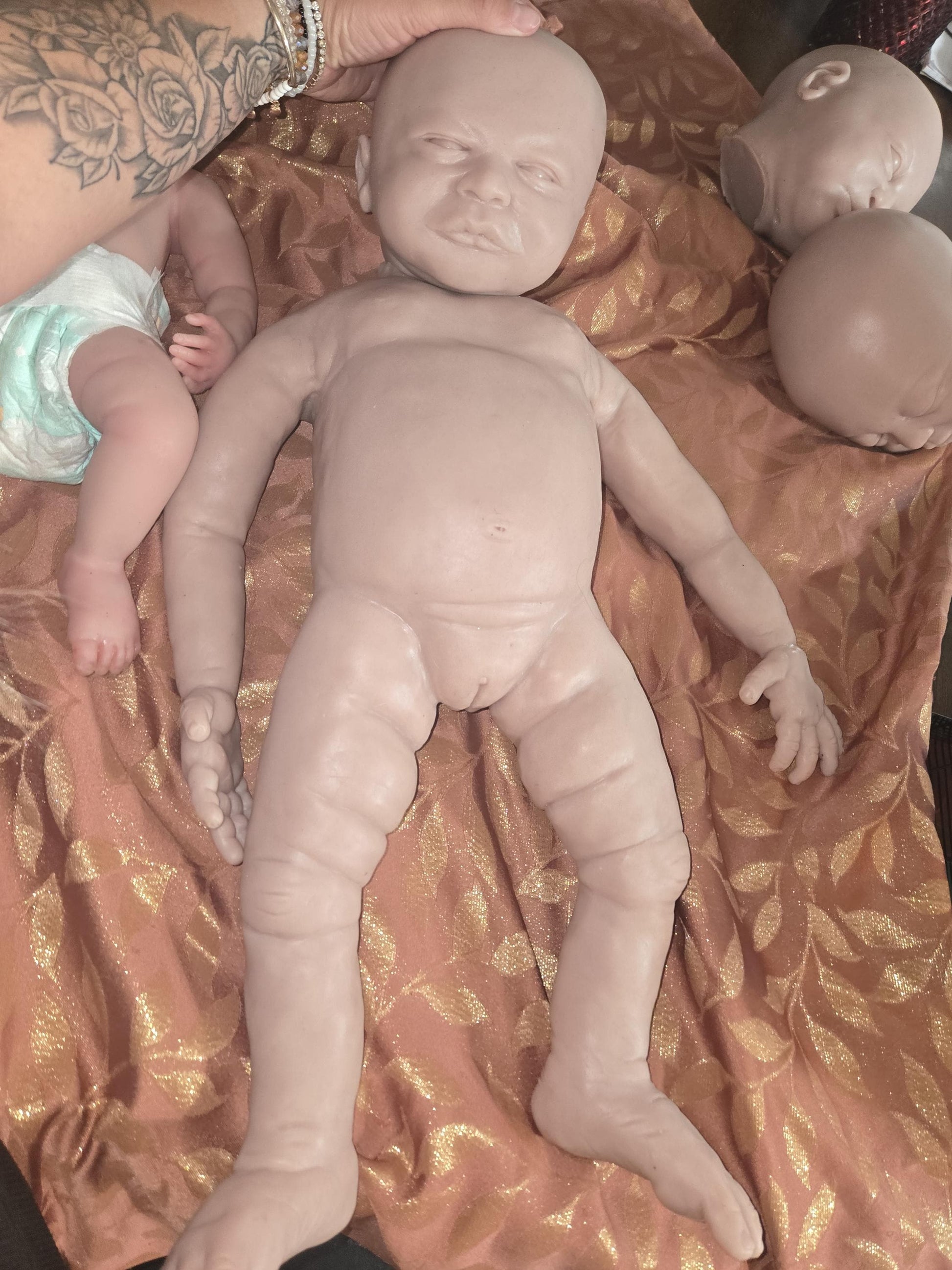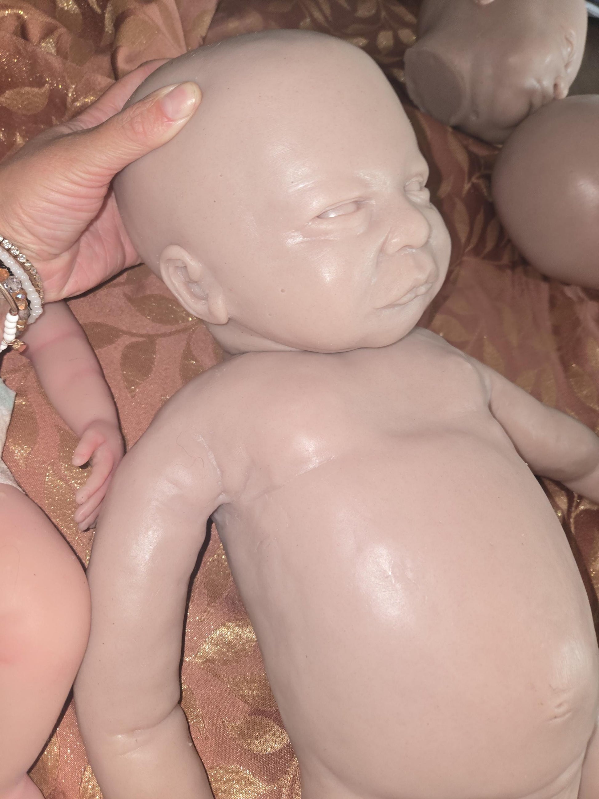 This little one is made from a flawless, seamless mold with beautifully smooth skin—no body seams The head is attached after pouring and you have three head options to choose from: two open-eyed and one sleeping. May have slight imperfections around neck area possibly.