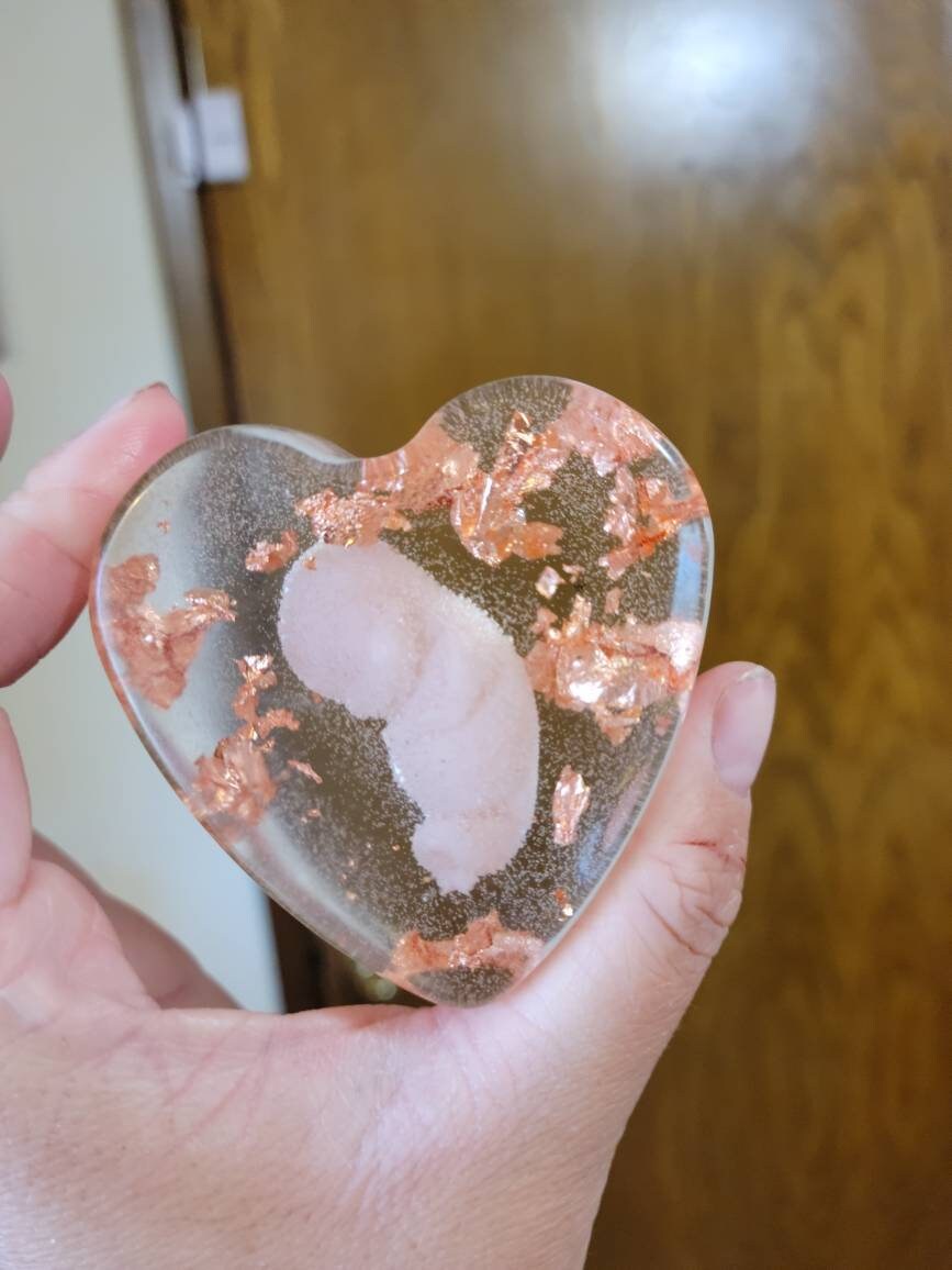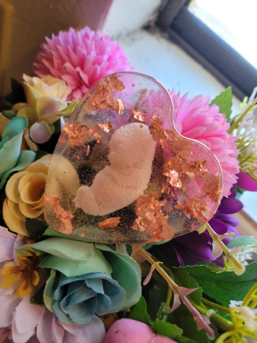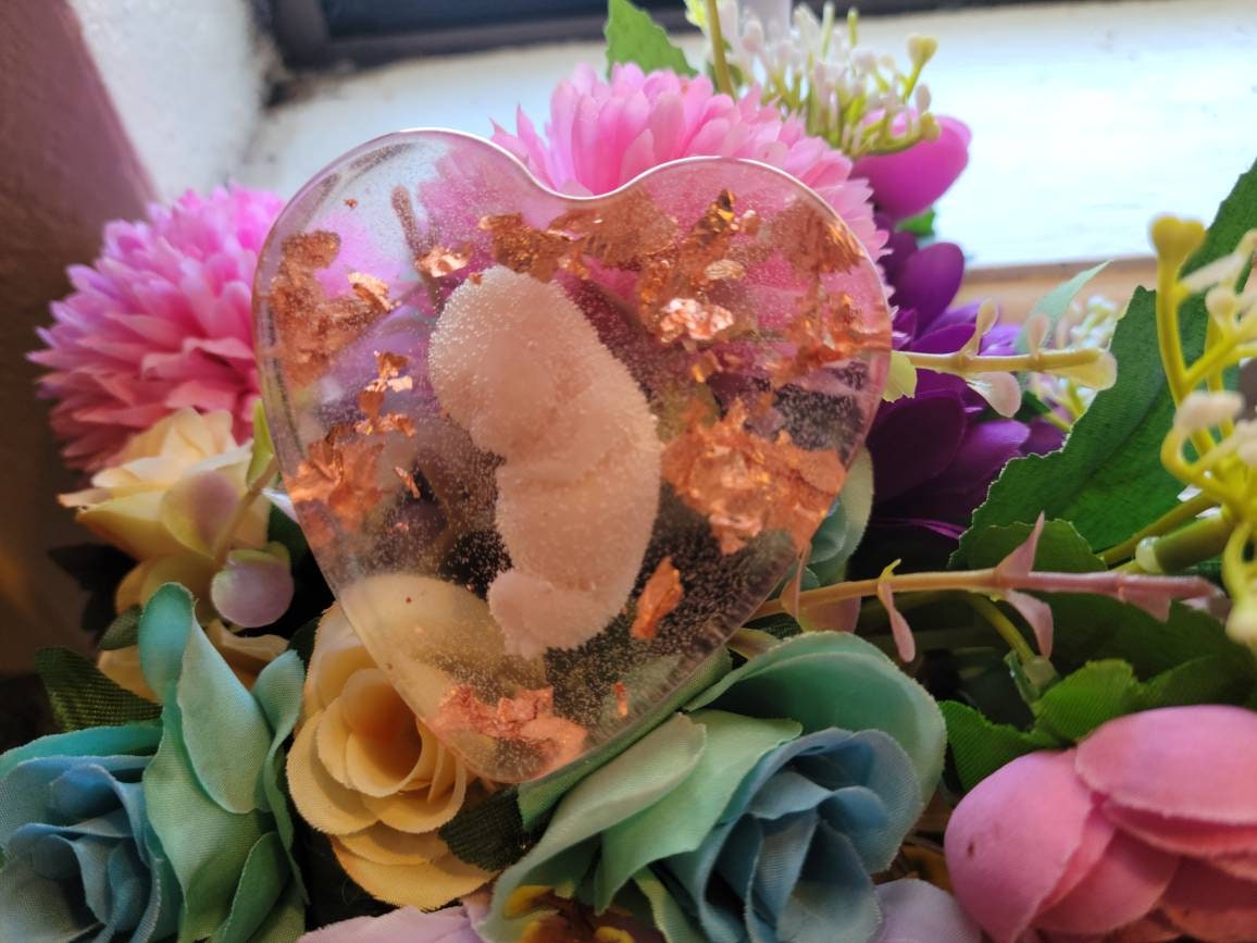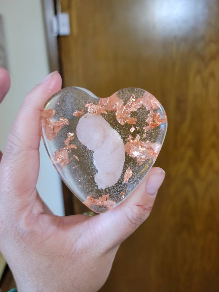 Silicone baby inside resin heart. Great memorial fetus gift or great if you've had a loss of your own. Made specially per order I can add any custom details upon request