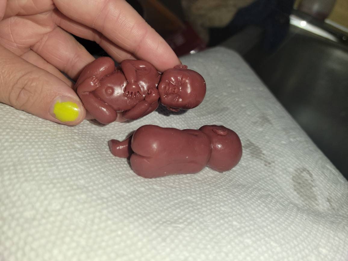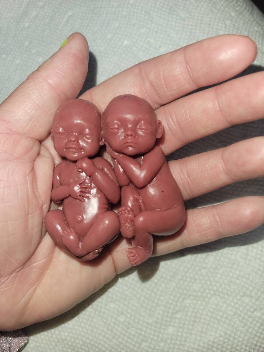 One twin is 12 week gestational the other is 13 week gestational size legs are bent, custom to order one has flat back one has flat side they are eco flex 10 silicone very squishy. Listing is for both babies. Normally $22 each. This is a deal on both together
