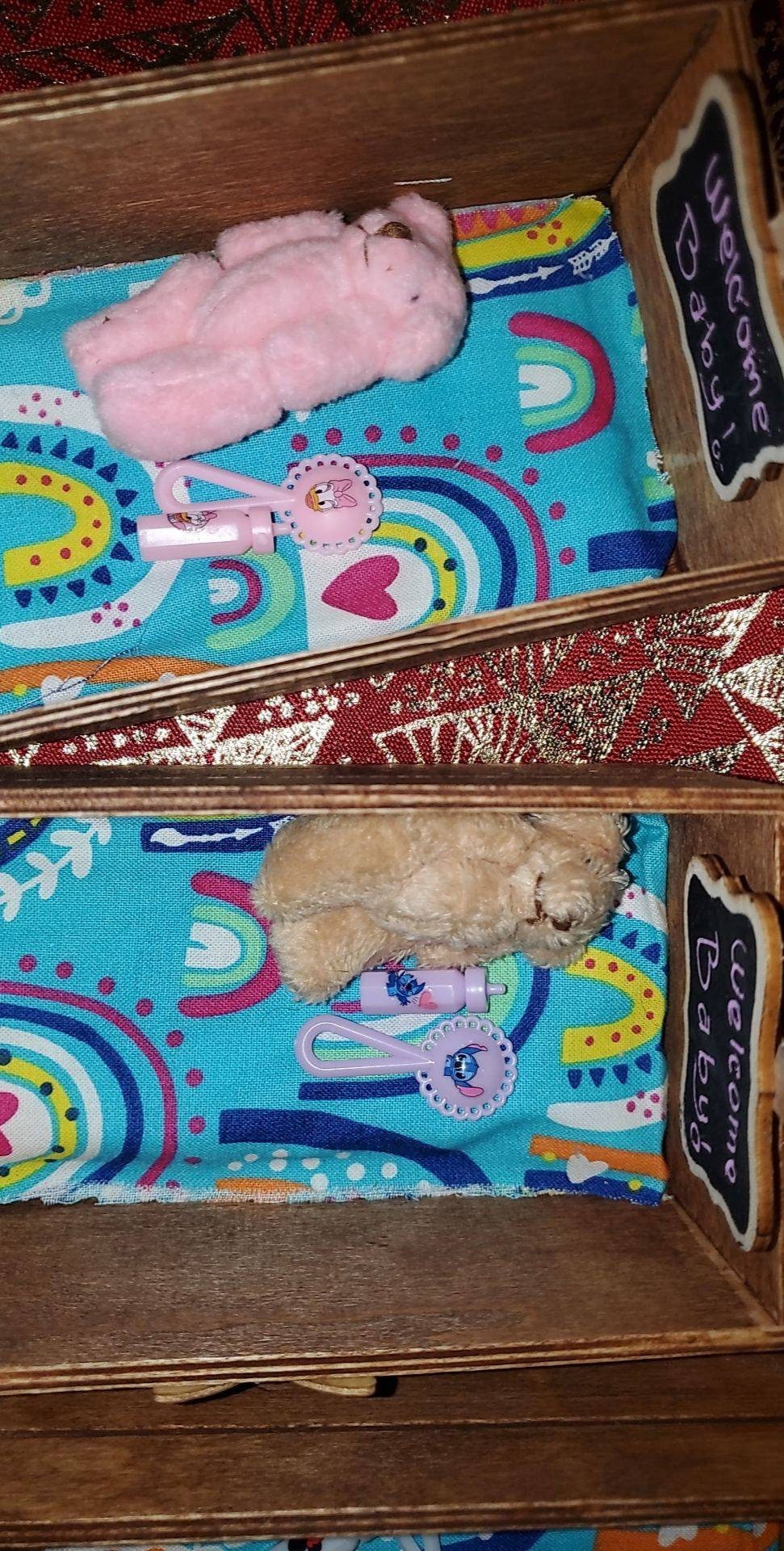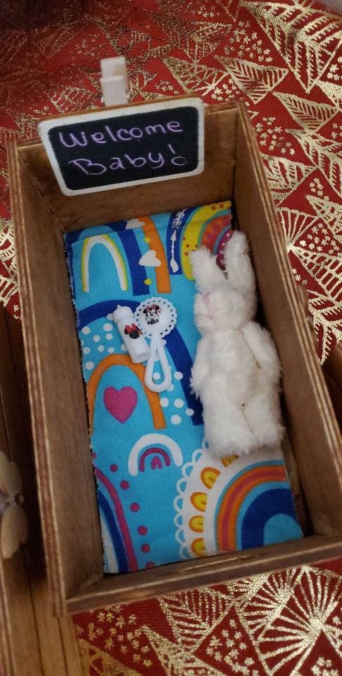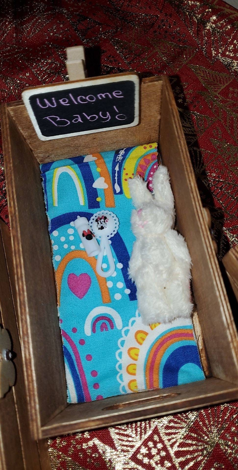 Miniature baby doll reborn silicone crib set with teddy, bottle, rattle, blanket pad, welcome baby sign for doll house