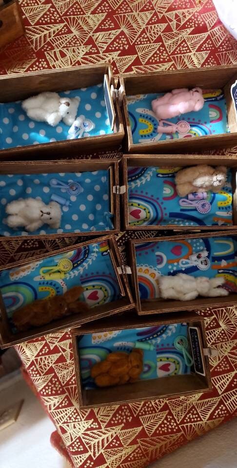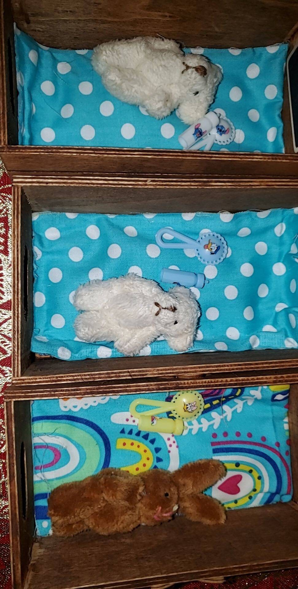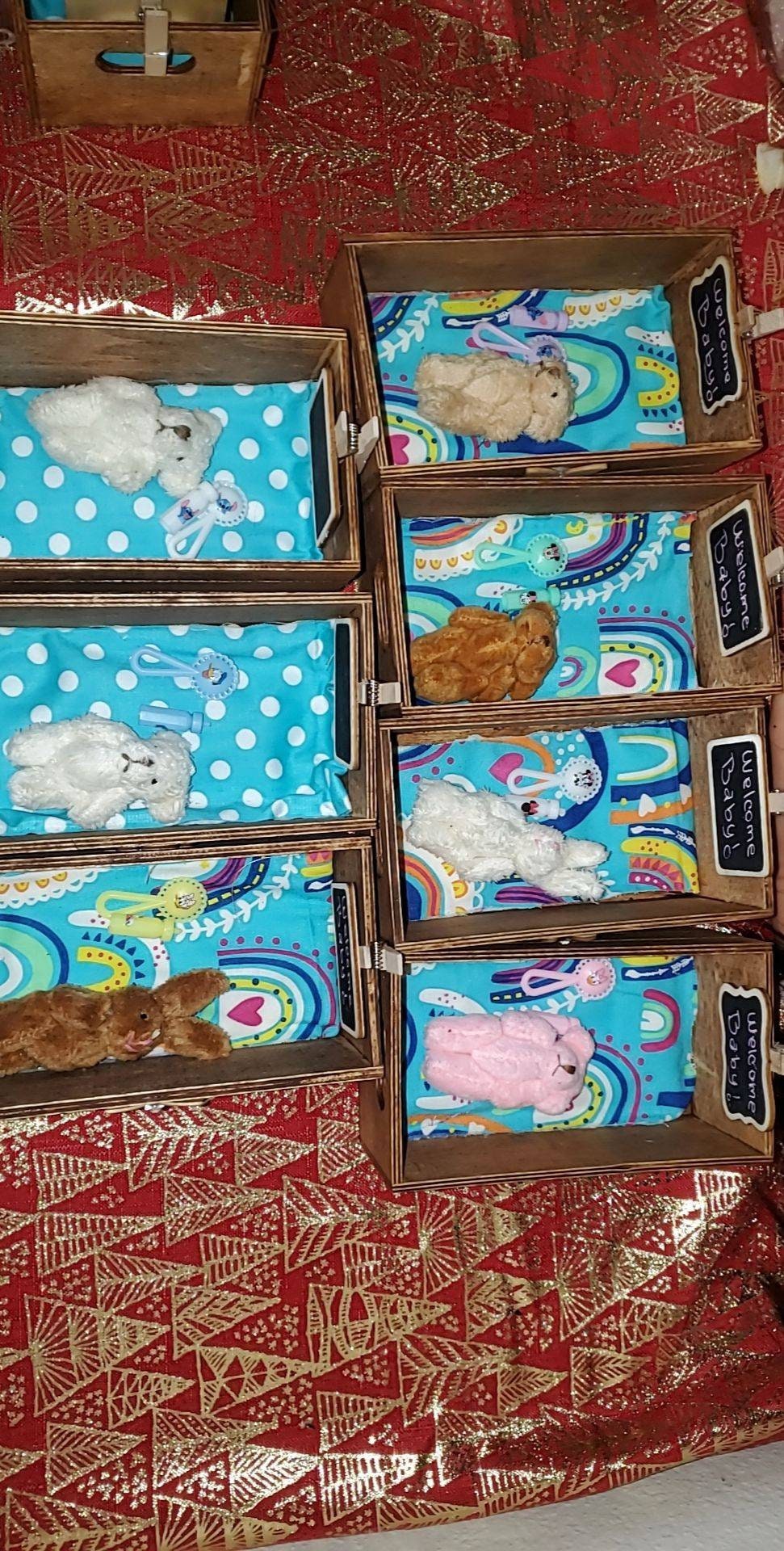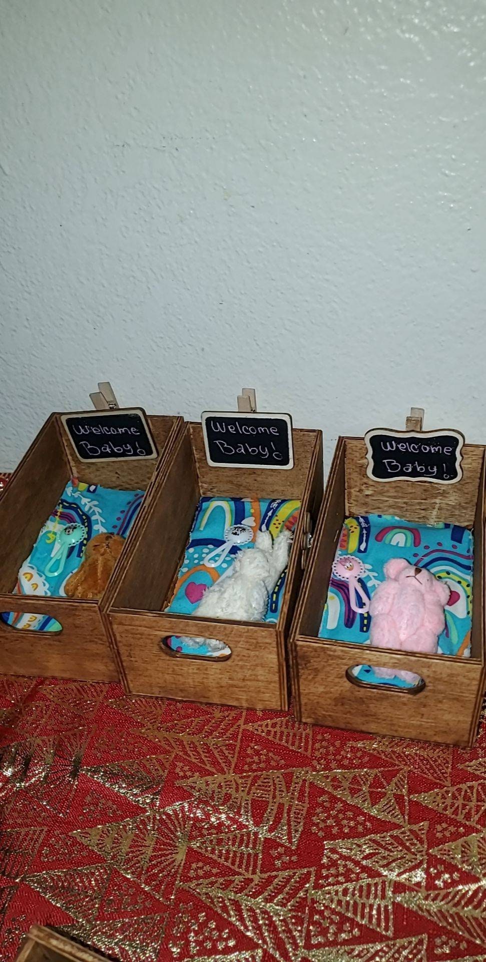 Miniature baby doll reborn silicone crib set with teddy, bottle, rattle, blanket pad, welcome baby sign for doll house