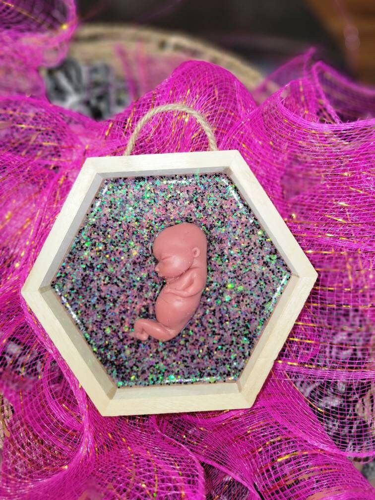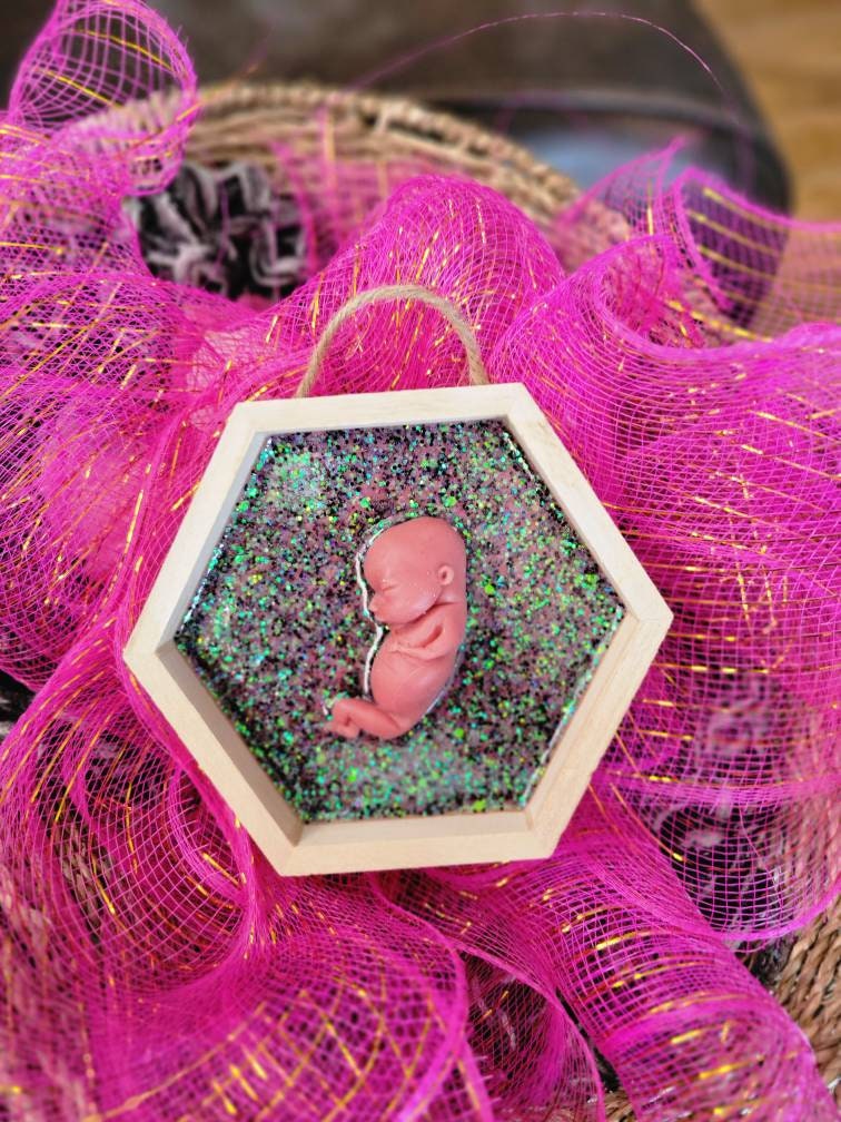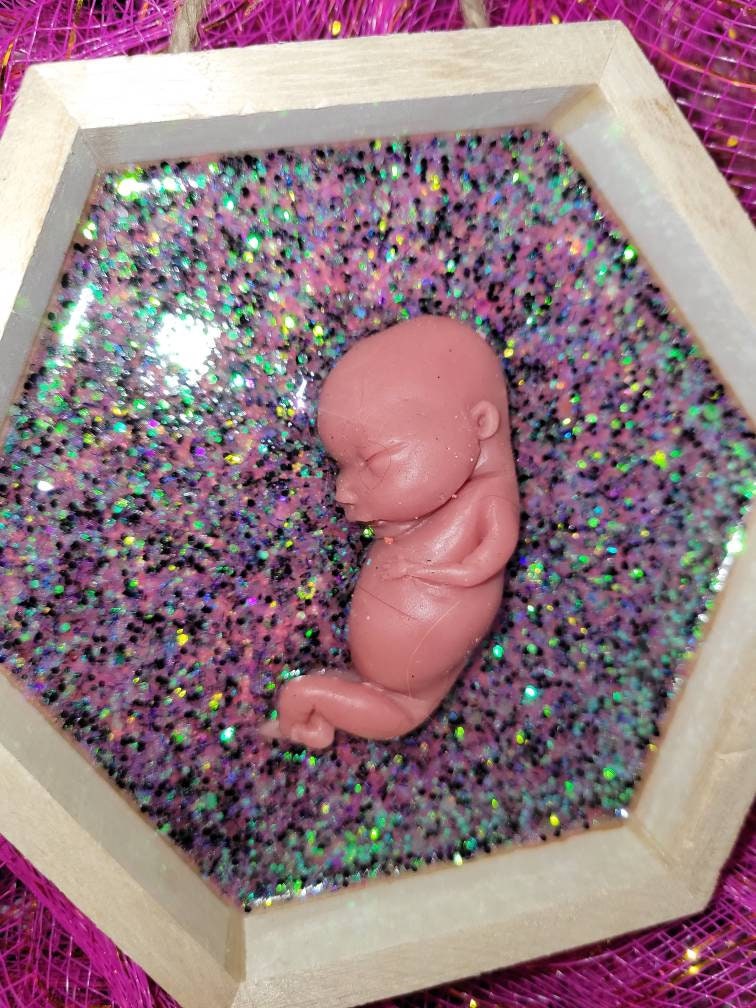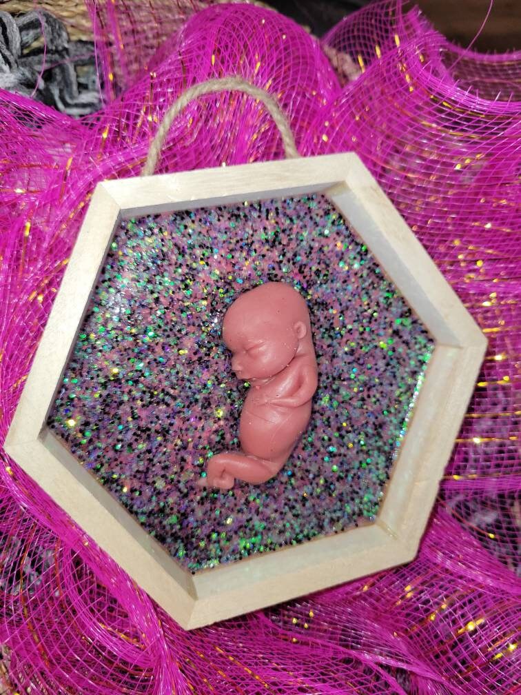 Ready to ship 13 week red silicone fetus in Beautiful glitter resin and wood frame that can be hung up