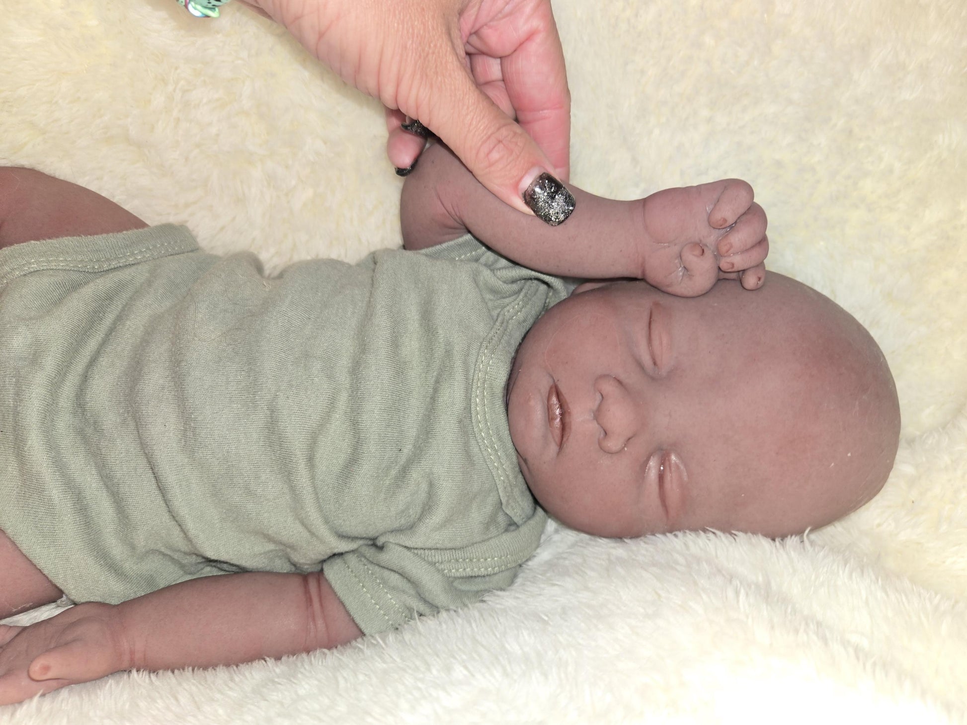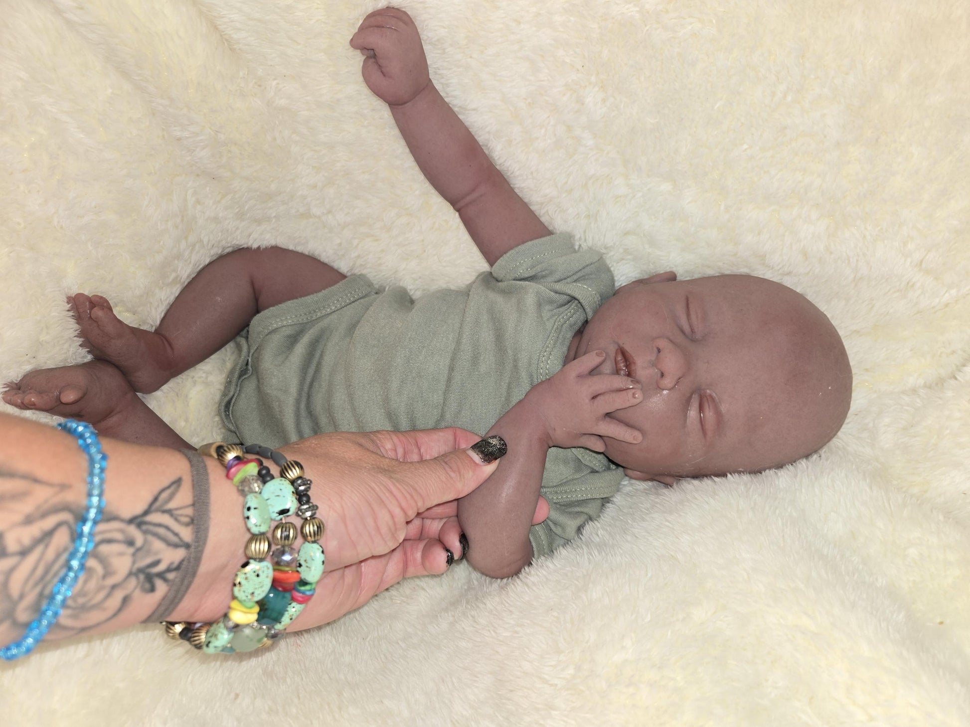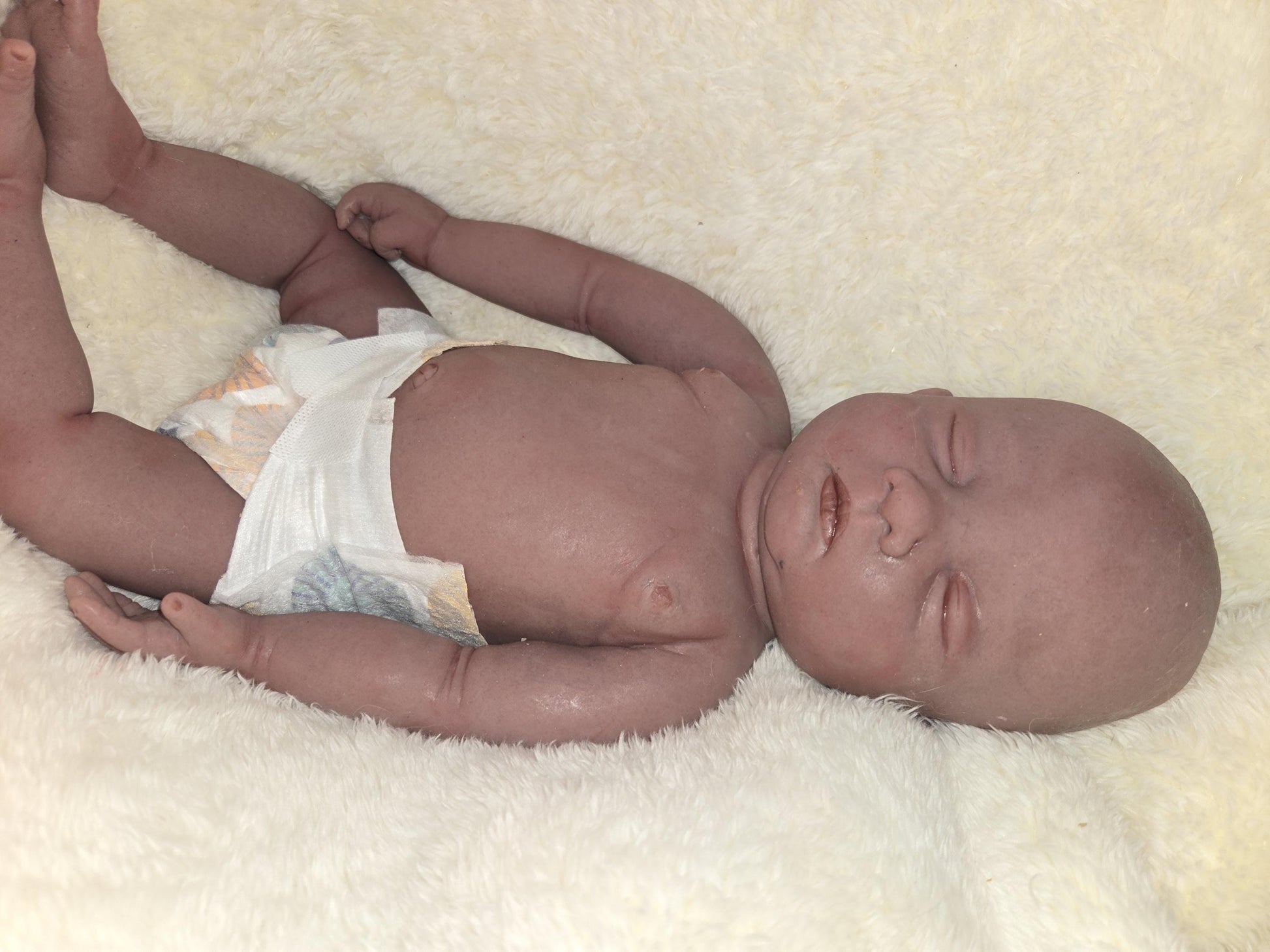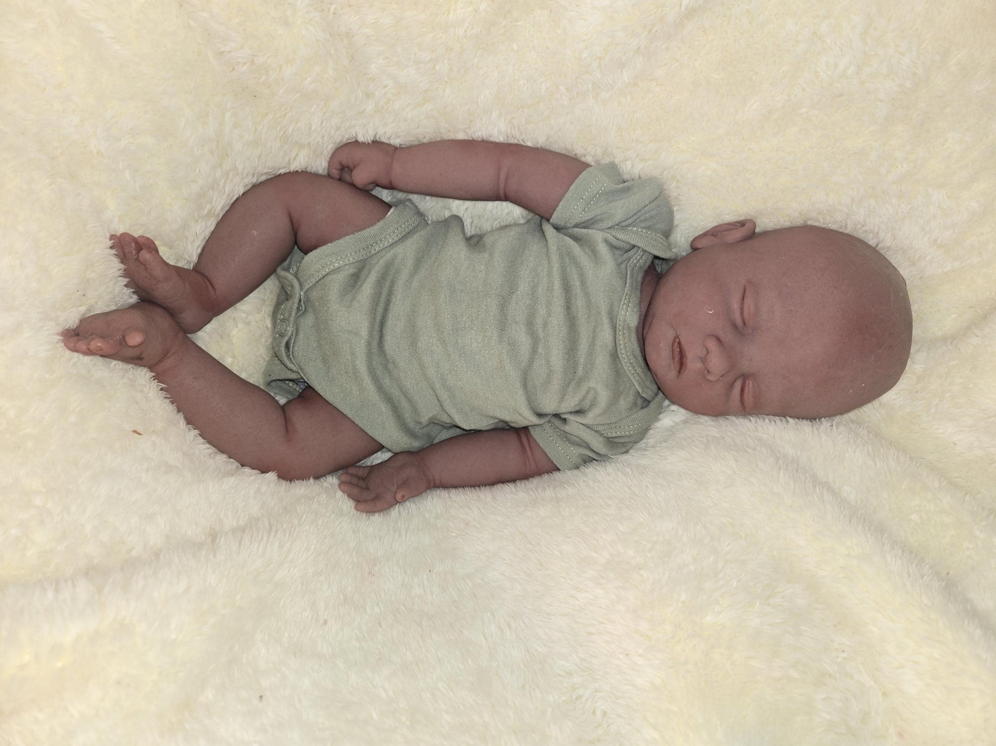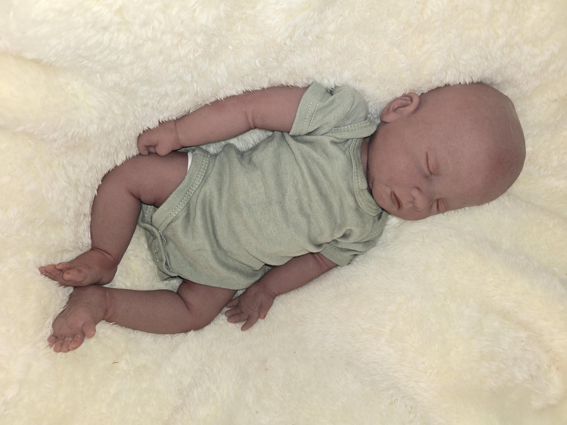 This sweet full-body silicone baby boy is fully painted and ready to find his forever mommy! Measuring approximately 18 inches long, he has been hand-poured in soft marshmallow blend silicone for an incredibly realistic, cuddly feel. His peaceful sleeping face, delicate newborn details, and smooth finish make him a perfect addition to any collection.
