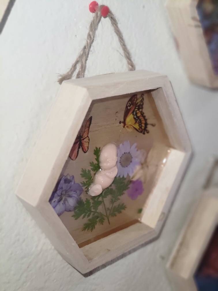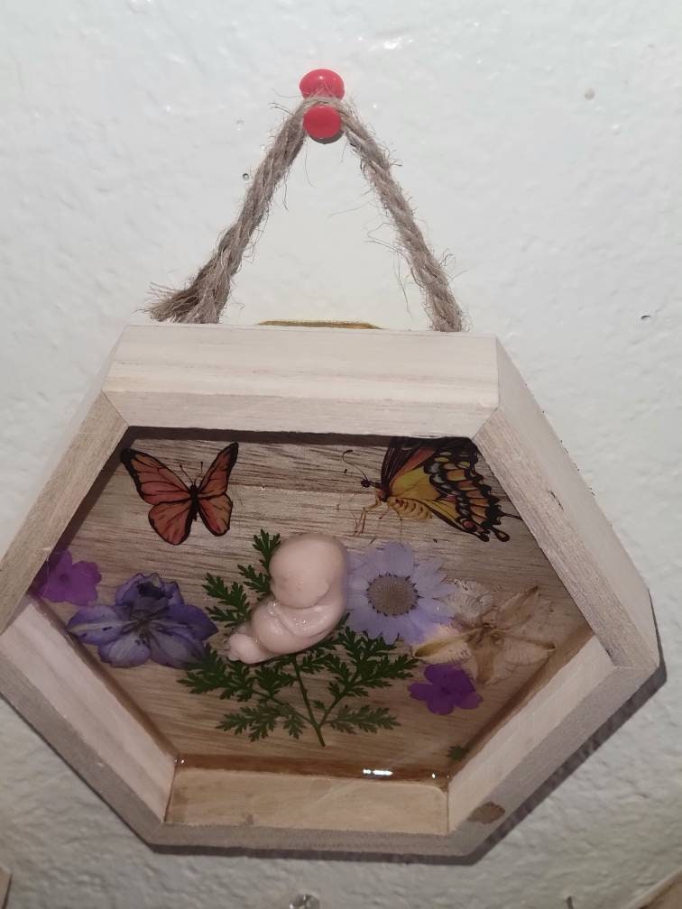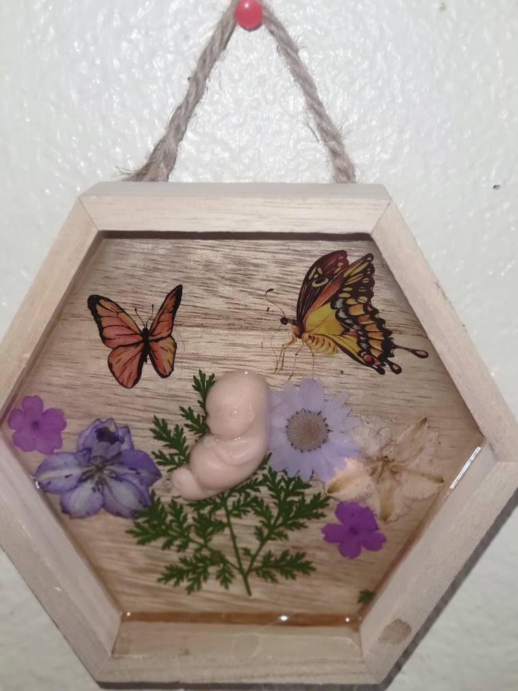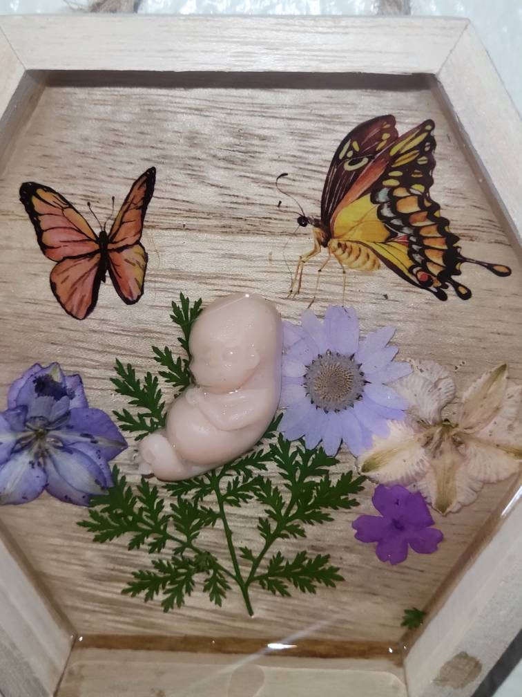 Ready to ship silicone memorial fetus in Beautiful wood frame with resin back drop 11 week