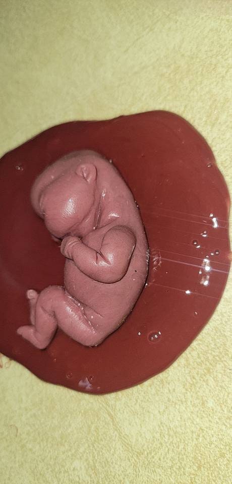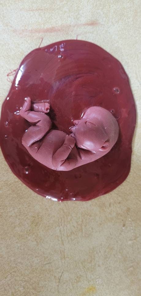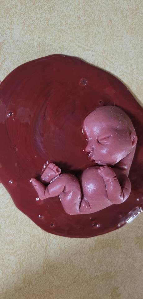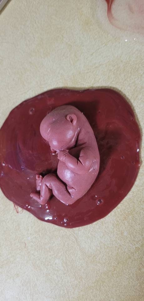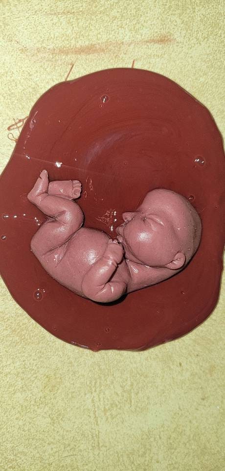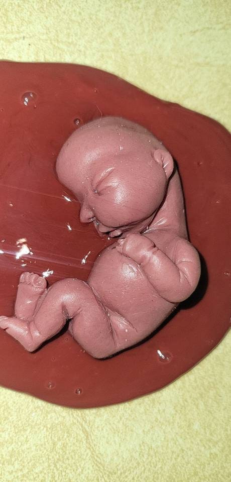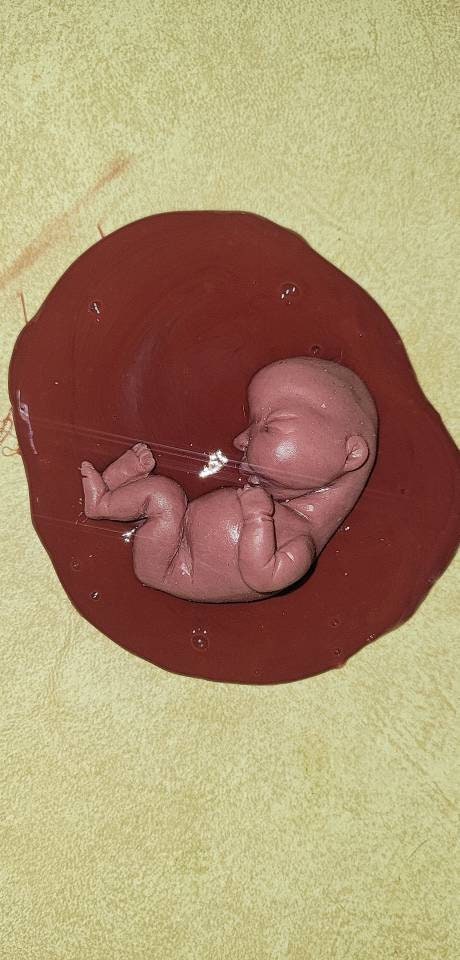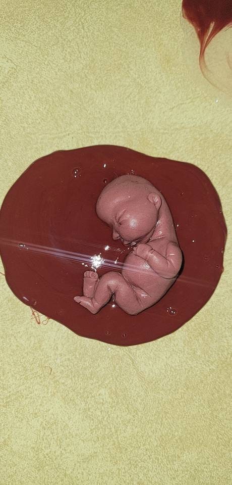 Silicone Memorial baby poured in eco flex 10 silicone womb is also poured from it so both very soft squishy and flexible the baby is stuck inside red womb. You choose size of fetus and color you want each poured as custom order, also comes with memorial keep sake. No returns. No cancelations.